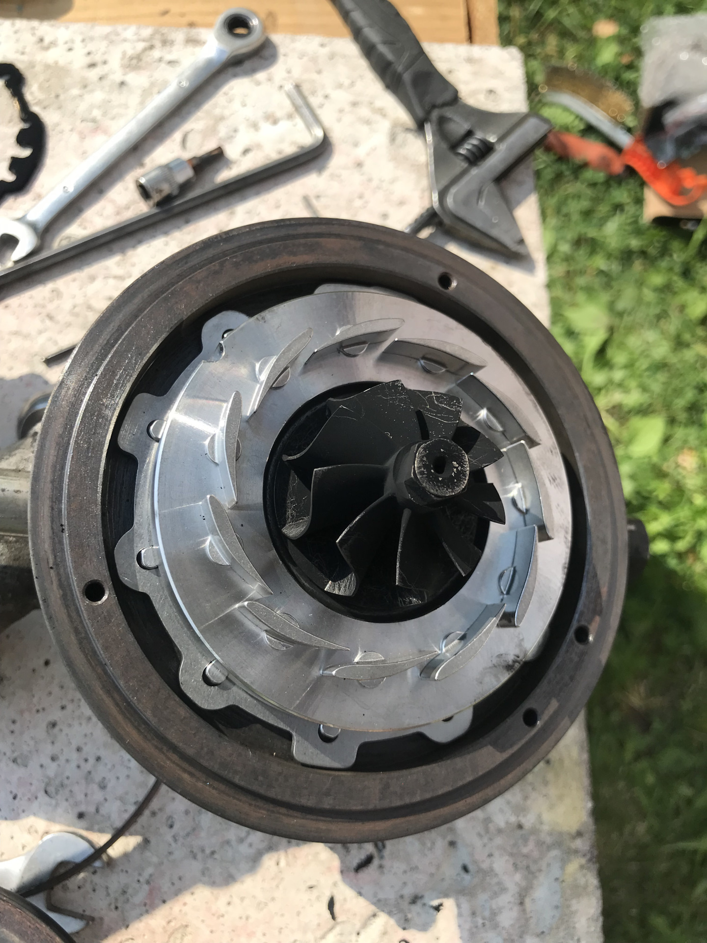 выбрал день, снял бампер фары, открутил железяку между фарами на которой замок капота и вот интеркулер перед нами, так же прикупил геометрию турбины, так как моя имела небольшие повреждения после того как через нее прошли обломки клапан, интеркулер снял вымол отпрессовал ( были трещины на пластике — заклеил епоксид 2-х компонентный, осталось небольшое травление из алюминия в месте крепления, решил оставить, так как минимально) снял турбину заменил геометрия турбины SsangYong D20DT 7614330002-VNT, отрегулировал зазор на 1.5-2 мм, все собрал назад, поставил новый клапан 6655404197 (модулятор турбо), заменил шланг вакуумный усилителя тормозов 4858009302, рассверлив отвод сверлом на 3мм по моему, ну и по темноте уже поехал на тест — Р1235, на утро тестером проверил датчик массового расхода воздуха — показания 1.012 ( приемлемо ). поехал купил датчик надува 6675420017 тот что в коллекторе стоит, когда менял обратил внимание на то что он весь в саже — хотя я его мыл и проехал на нем после мытья 100км, заменил без результата, НО мысли появились — турбина нагнетает и через разбитый латунный подшипник скольжения в котором ходит шток ЕГР давит на мембрану снизу открывая тем самым клапан ЕГР и сбрасывая туда давление и забирая от туда сажу которая осела на датчике давления турбины.