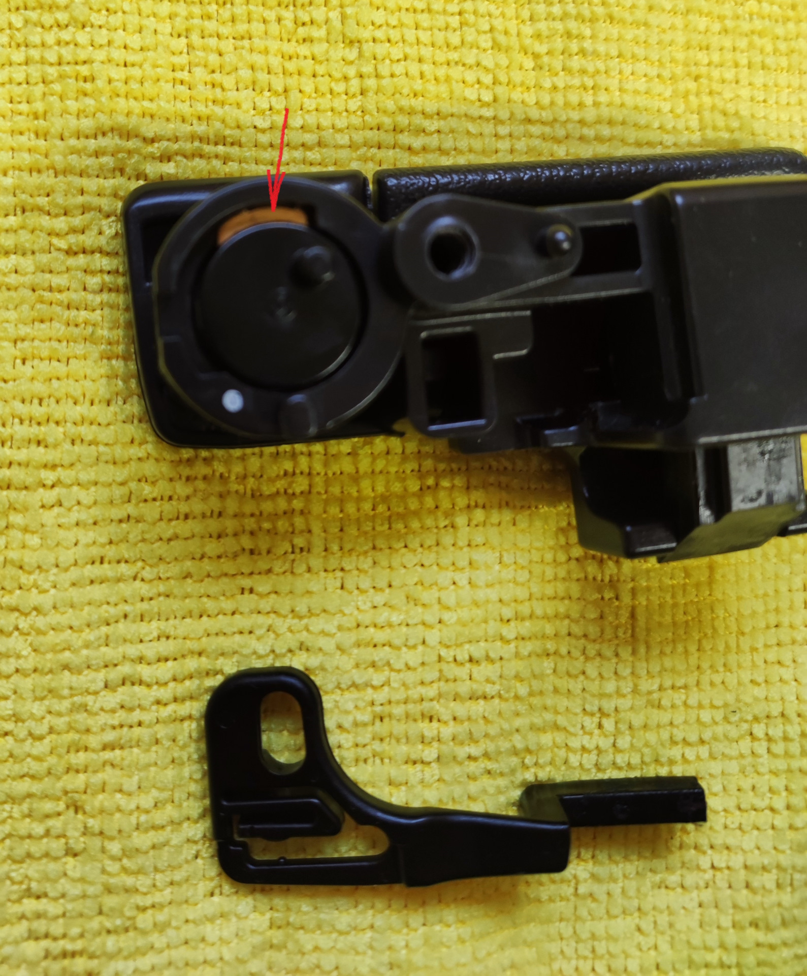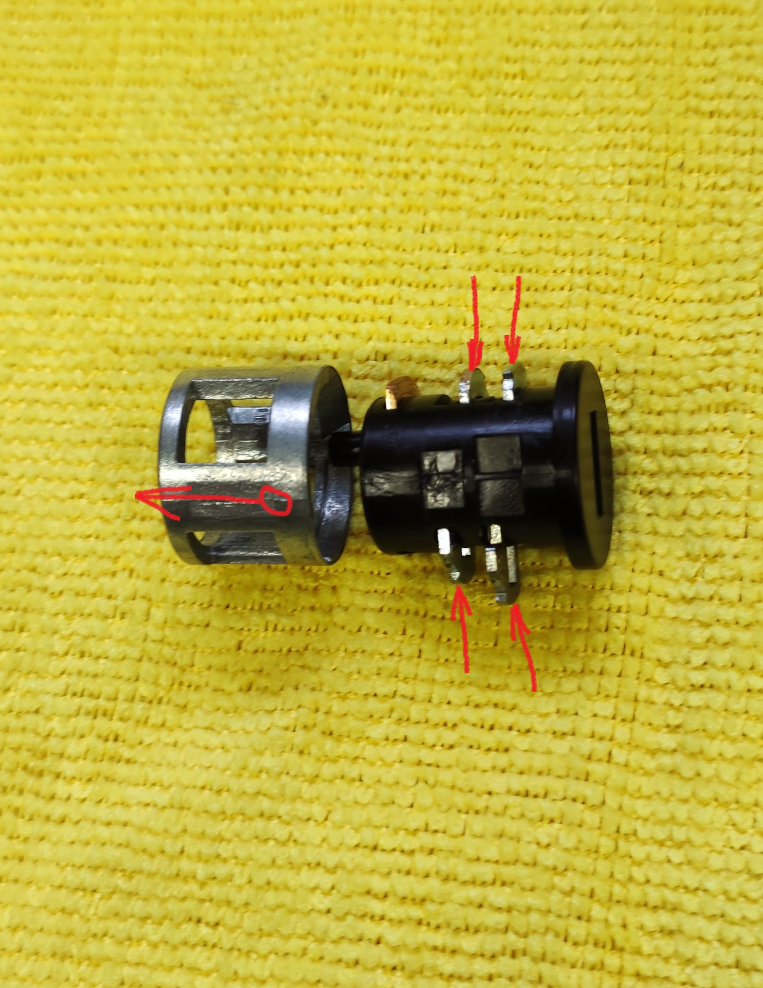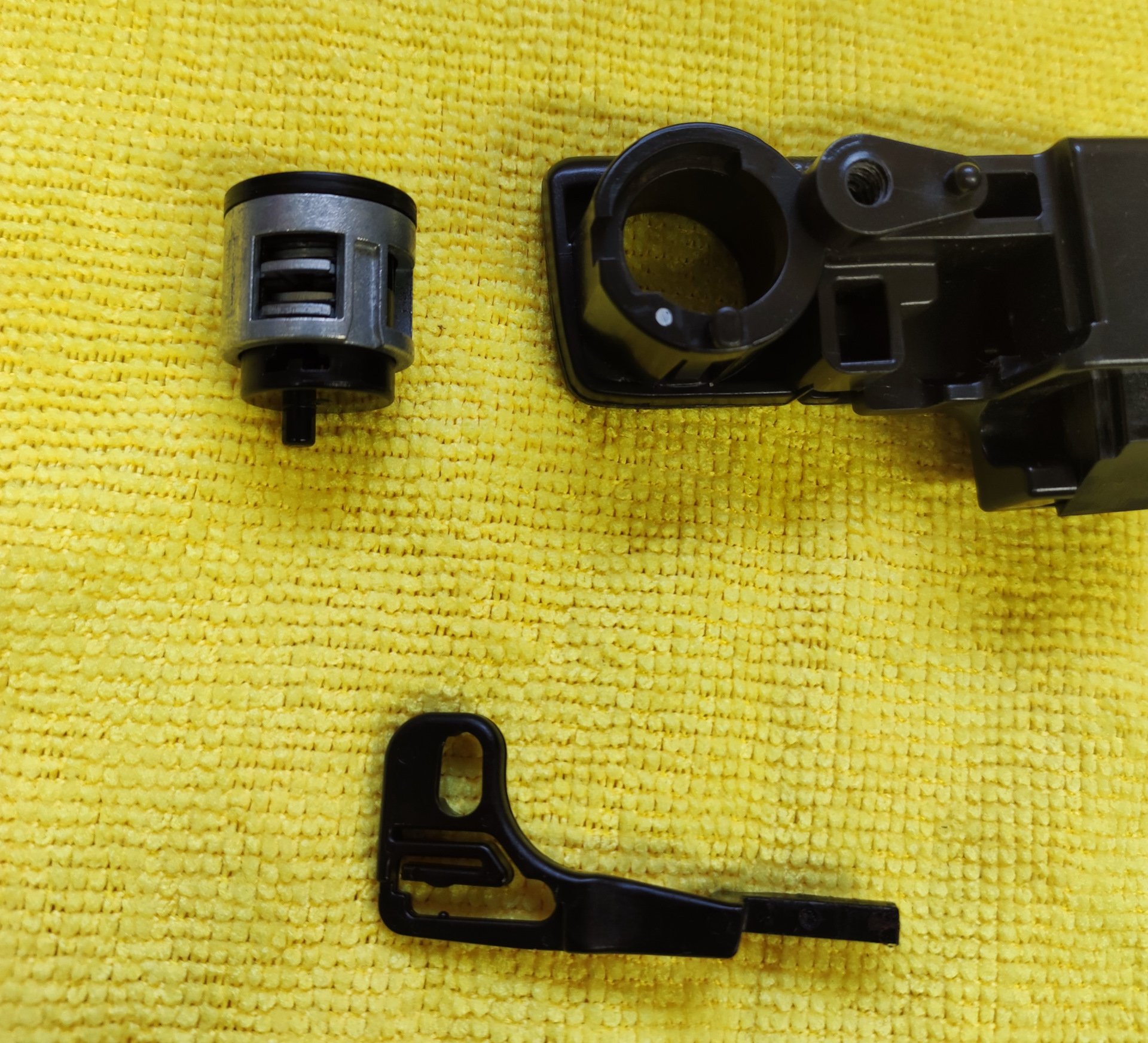 Чтобы без проблем вставить личинку назад в замок, нужно сделать так как на фото — фиксатор (показан на 4 и 5 фото) утопить и прижать его силуминовым кольцом. Потом аккуратно в таком положении вставить в замок. Там есть пазы, ошибиться не возможно.
