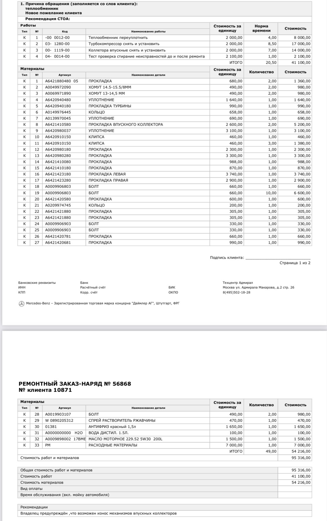 2. Профильный сервис по мерсам, где обслуживаю машину 2 года уже- (Адмирал)выставили 95тр 🤬(41тр работа и 54тр запчасти. После осмотра, и когда залезли вовнутрь. Список на фото).
