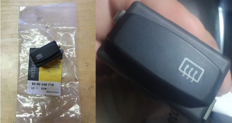 — кнопка — выбирал-выбирал и остановился таки на родной реношной, встающей в штатные пазы — пара вариантов — кнопка обогрева заднего стекла Renault Clio II (после 2006) — 8200446719 (за 428 руб), или от Renault Traffic (Opel Vivaro) — 7700313155 (GM 91167498). На вид одинаковые. Взял 8200446719.