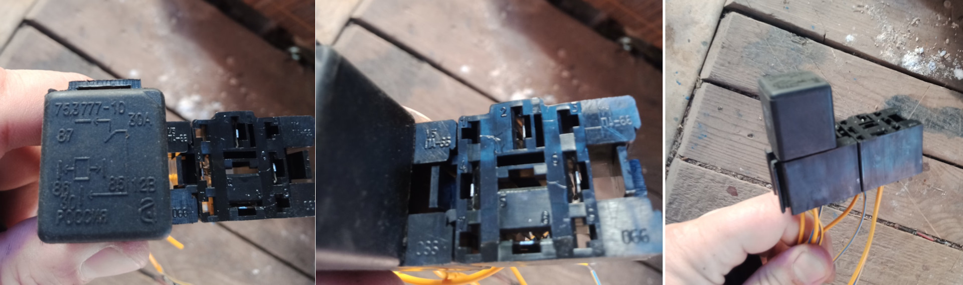 — реле замыкающее (проходное) — 2 шт — 75377710 (по 62 руб) (одно отработало всего неделю, точнее 4-5 включений, об этом ближе к концу пьесы) (или 90374710, или 98.377710, или 75.3777.000-10, или на крайняк 21100374721021, или реле стартера 71.3747 (там с запасом на 50А)) (или для фанатов — 8200351489, колодку сами ищите)