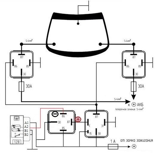 В моей заводской схеме не было в принципе обогрева лобового стекла (кстати и на дизеле [российской сборки, не знаю как с румынской сборкой ]так же обогрев не шел).
