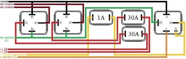 Реле 3 всего (таймер/управление и по релешке на каждую половину стекла (силовые)). Можно в принципе 2-мя обойтись — таймер и одно помощнее на обе половины.