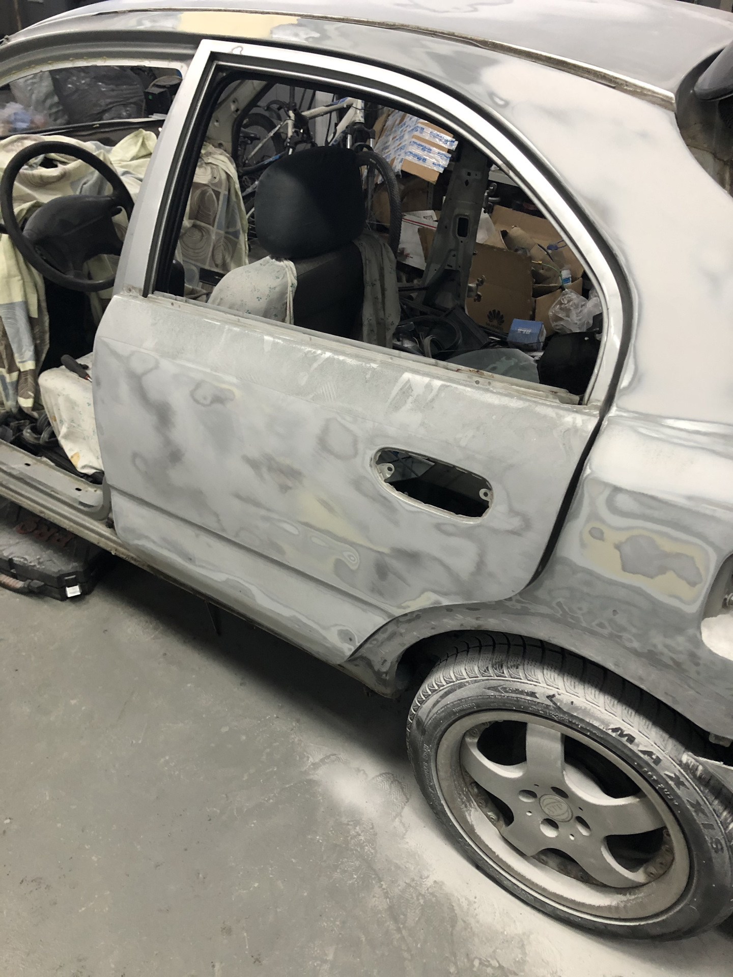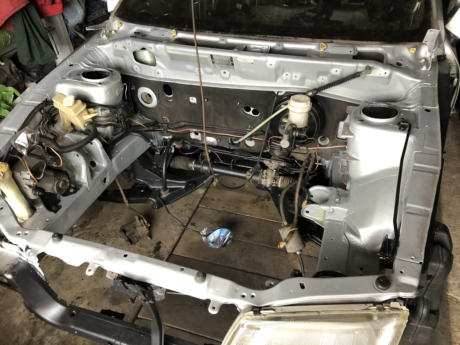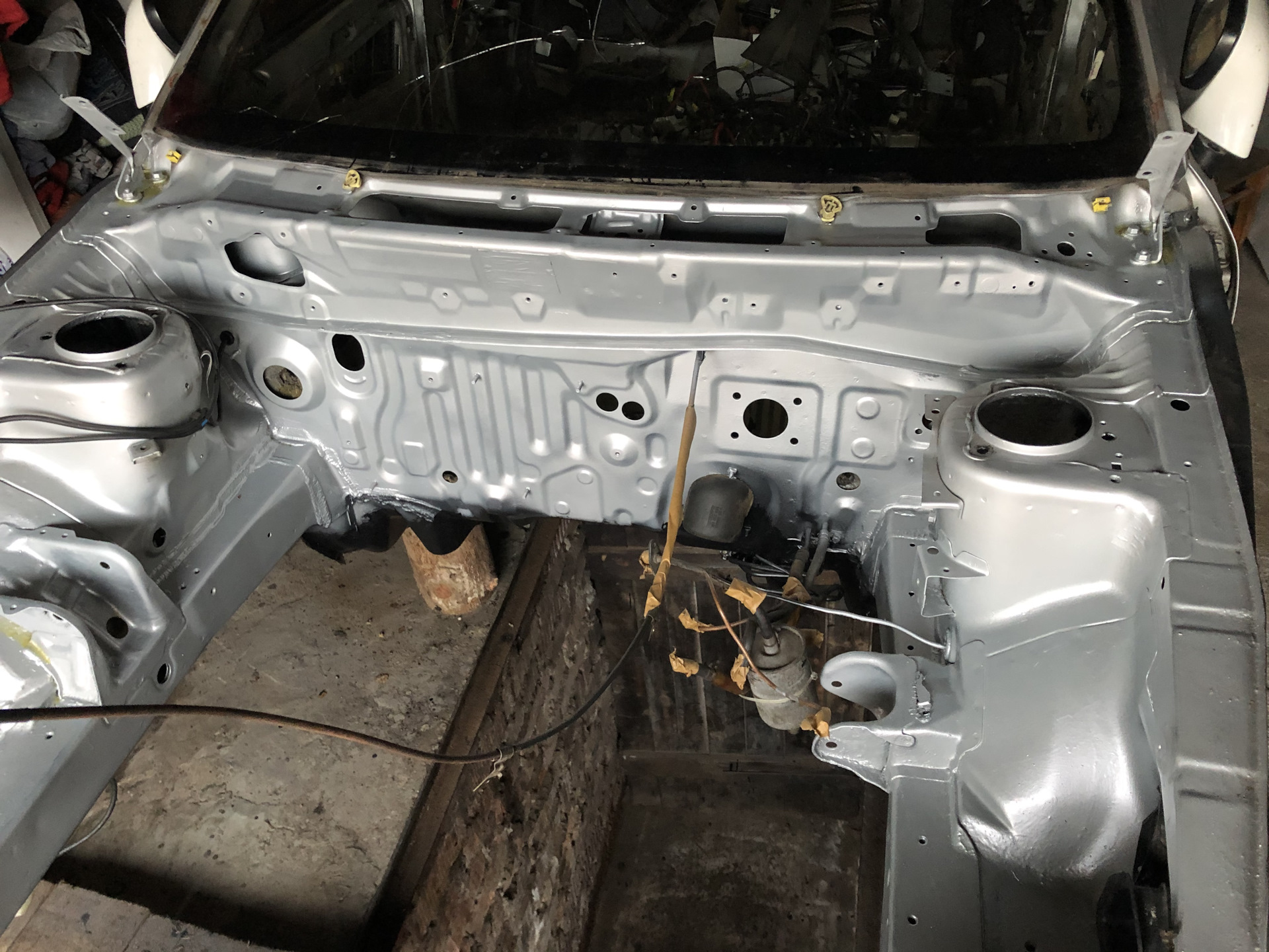 Была установлена передняя подвеска с донора и машина уже могла передвигаться самостоятельно. Далее необходимо было привести в порядок кузов. Это было самое долгое и сложное, так как были заменены пороги, задние арки, крылья передние, капот, две двери и крышка багажника+плюс полный облив. Данную работу выполнял уже не я.
