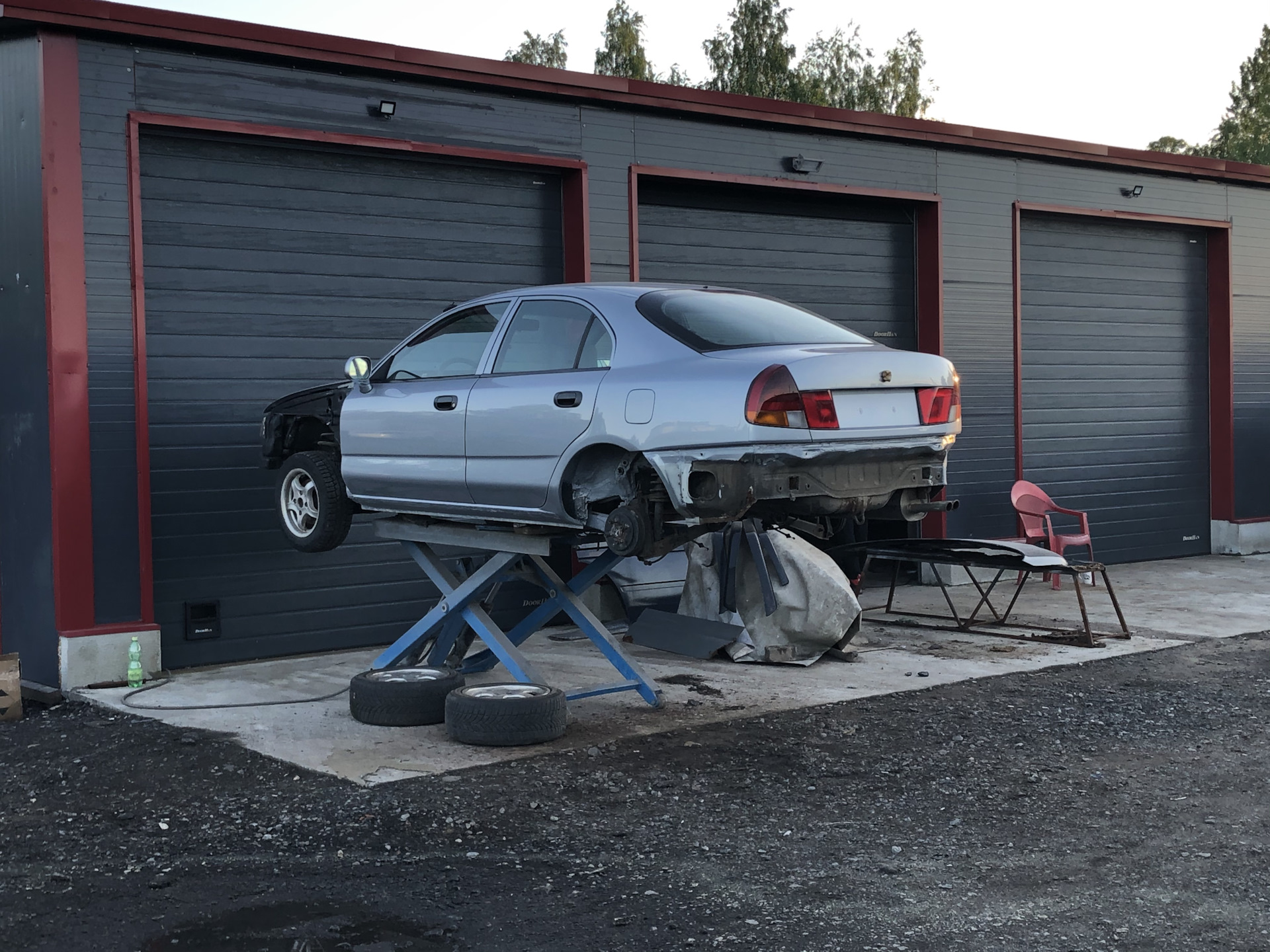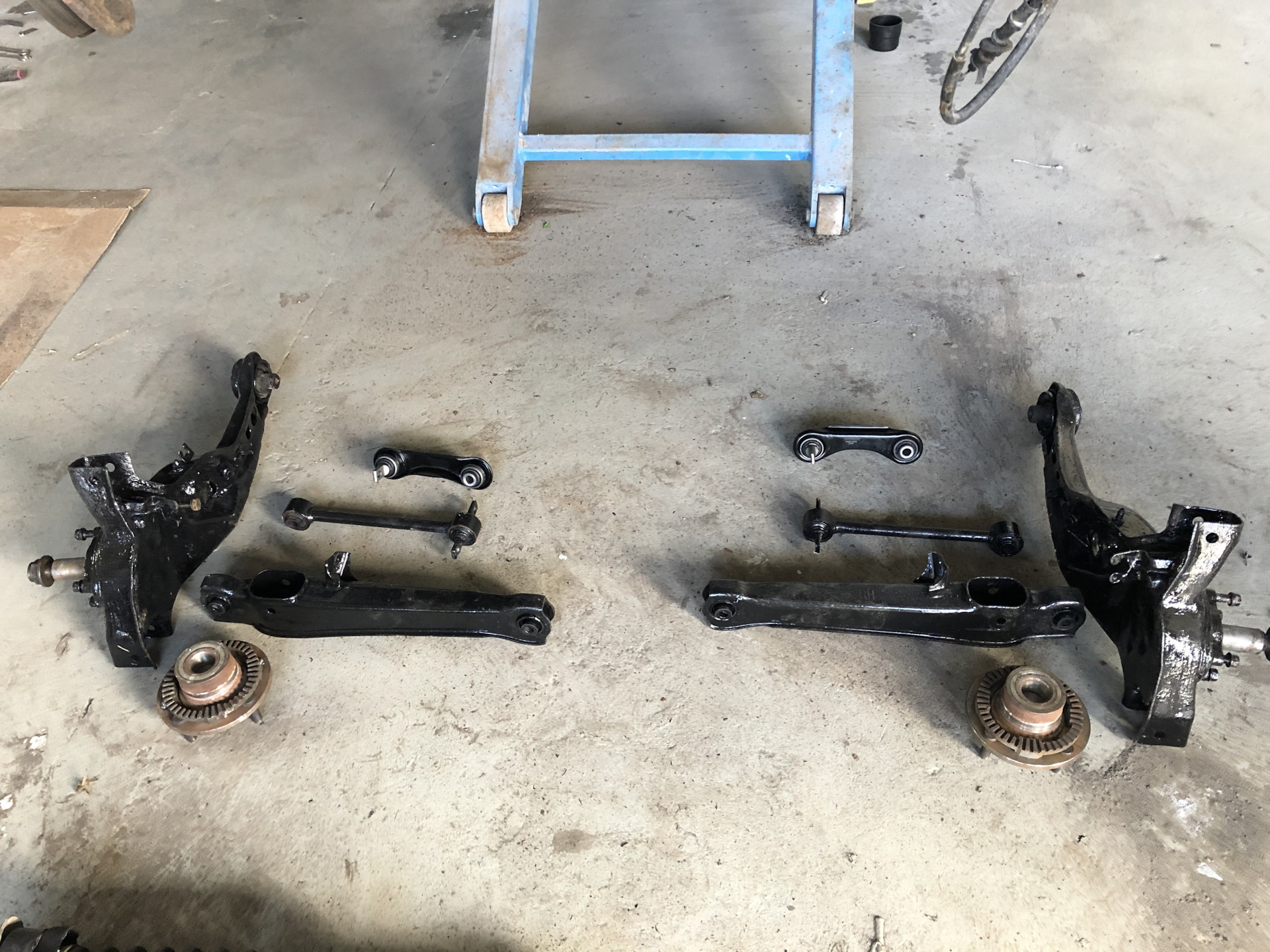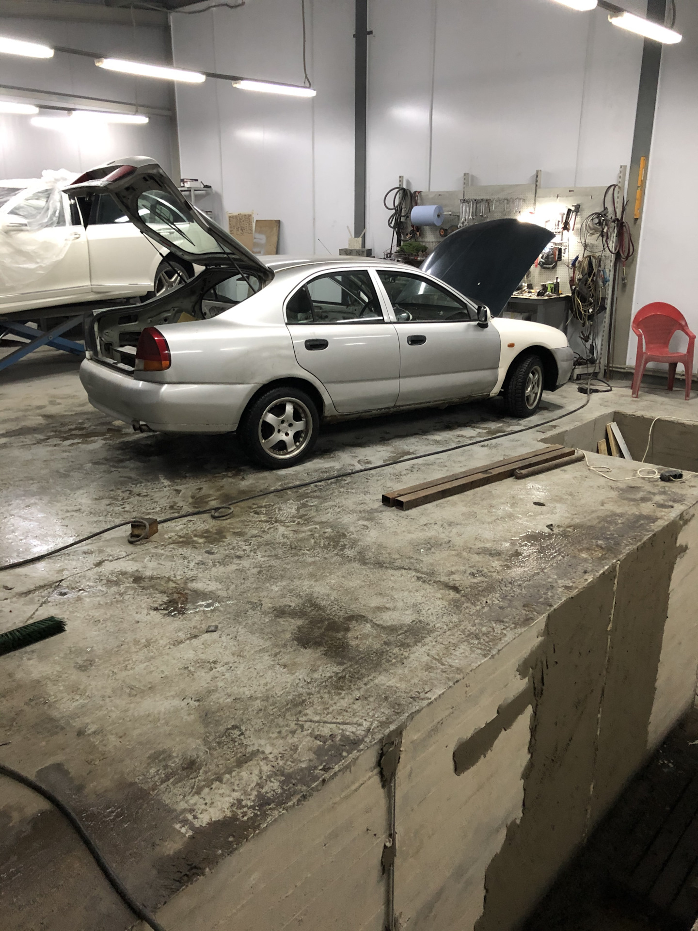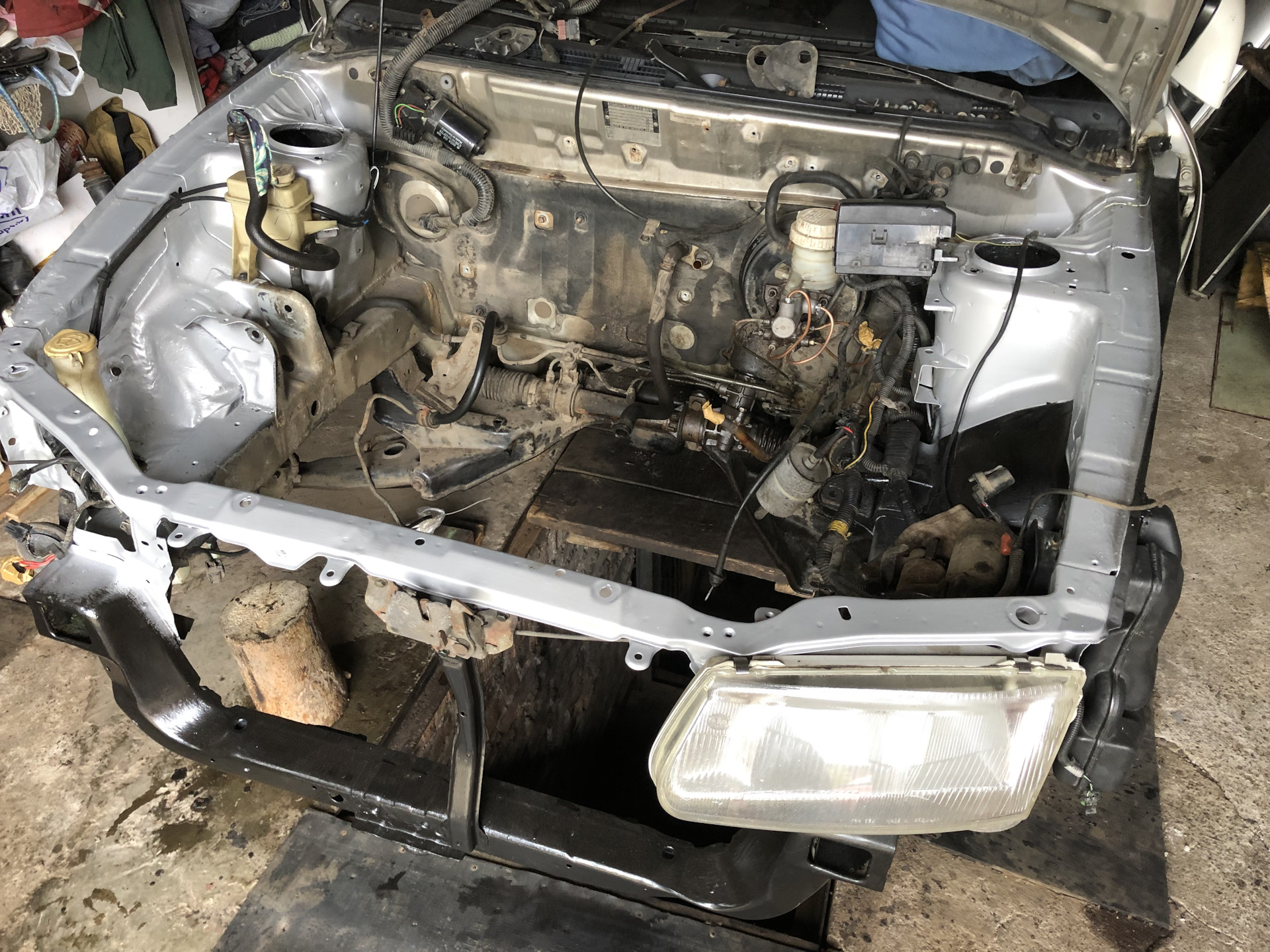 Была установлена передняя подвеска с донора и машина уже могла передвигаться самостоятельно. Далее необходимо было привести в порядок кузов. Это было самое долгое и сложное, так как были заменены пороги, задние арки, крылья передние, капот, две двери и крышка багажника+плюс полный облив. Данную работу выполнял уже не я.