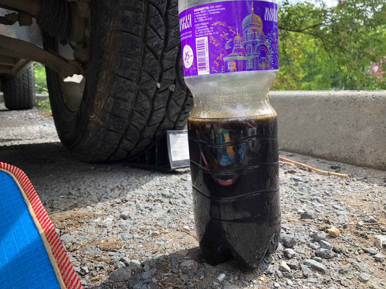 С раздатки слилось чуть меньше (хотя по мануалу туда должно влезать больше, литр). Сама слившаяся жижа была не черная как с дифференциала, а темно-коричневая, похожа на походившее моторное масло. На магните есть совсем чуть-чуть каки. Свежей залил почти литр, пока не потекло из заливного.