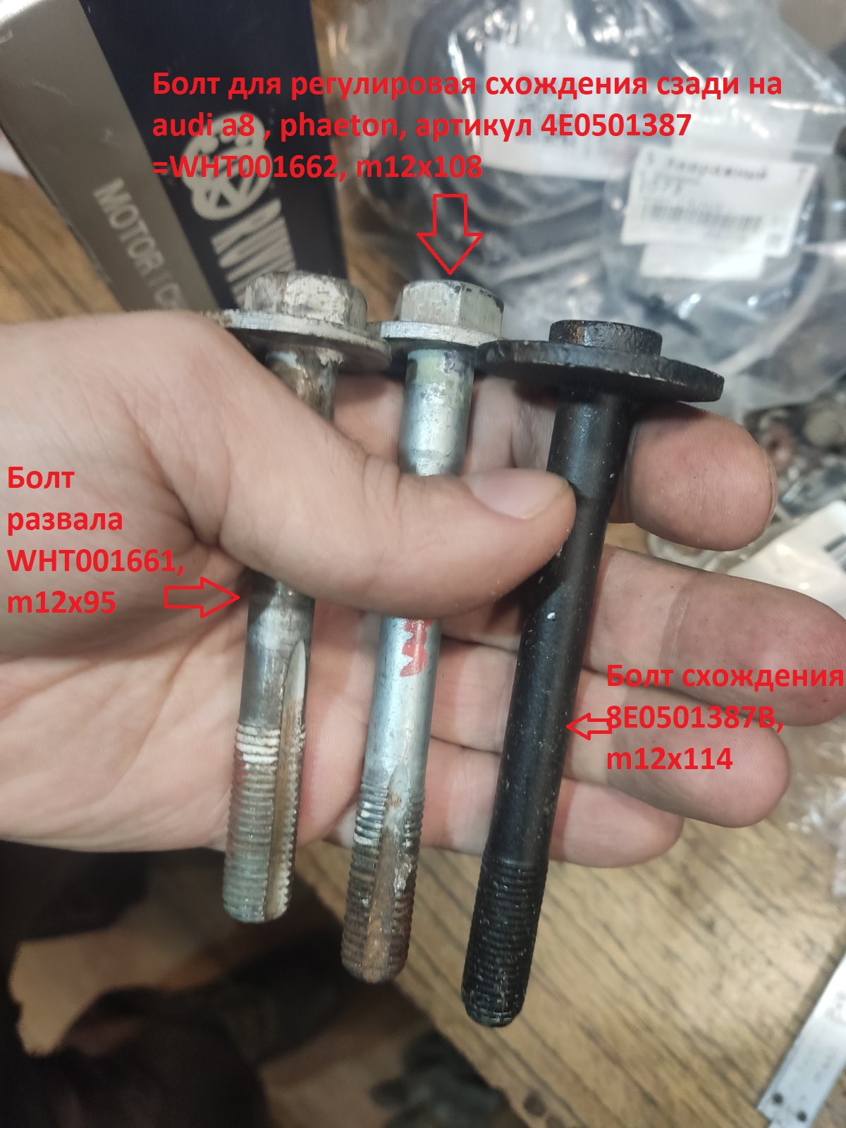 3.) Болт для регулировая схождения сзади на audi a8, phaeton, который база выдает как аналог, но нам не подходит, в связи с тем, что имеет размеры m12x1.5x108 (Чуть короче, хотя кто его знает, я не проверял) имеет артикул 4E0501387 =WHT001662