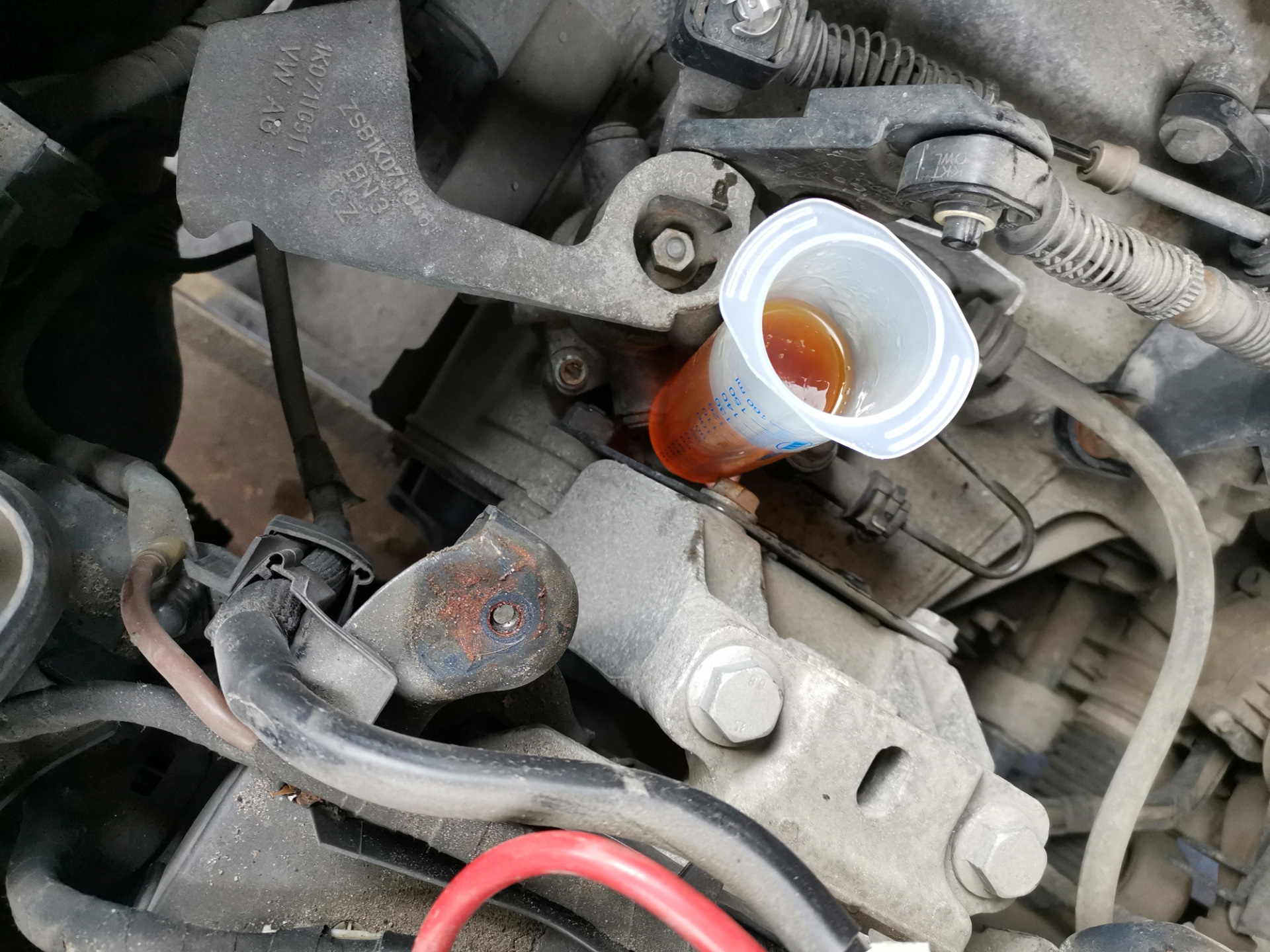 Скинул защиту, площадку аккума, и корпус воздушника. Коробку в нейтраль, открутил верхнюю опору, затем нижнюю и полилось) Сразу почувствовал запах маринованных огурцов, после пахло малиновым вареньем))) Первый раз такое) Затем закрутил нижнюю опору и начал заливать масло.