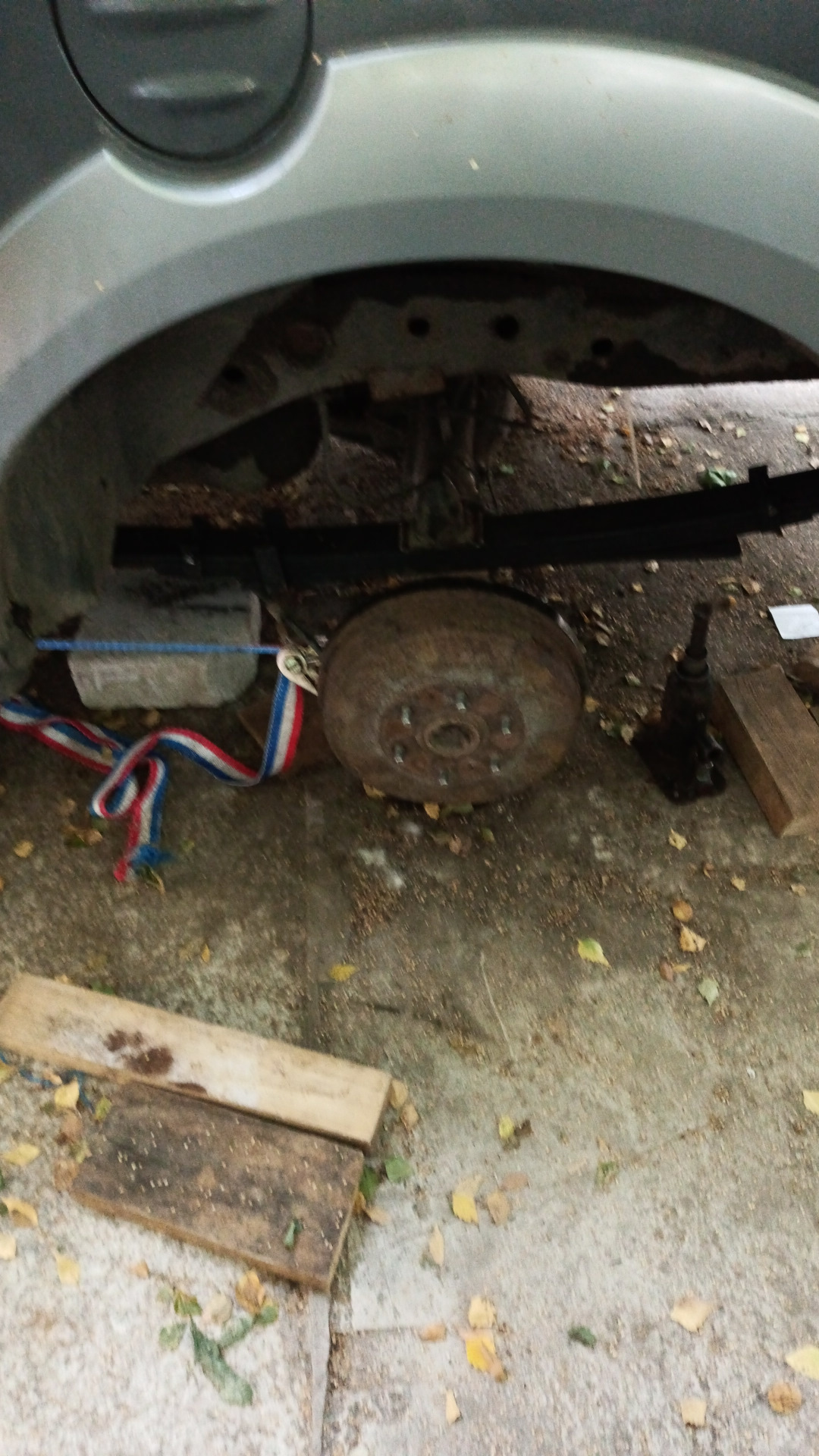 Следующая засада, когда ослабил правую сторону, мост ушел назад, и никакими силами не соглашался совмещается с рессорой, использовал стяжку для груза 1т и дешманский буксировочный ремень на 2 т, так как родной ремень лопнул, натягивал и им и монтажкой, с помощью кувалды удалось совместить пимпку рессоры и мост. Левая сторона так себя не повела, там достаточно просто все совместил, хотя на всякий случай стяжкой зафиксировал и там.