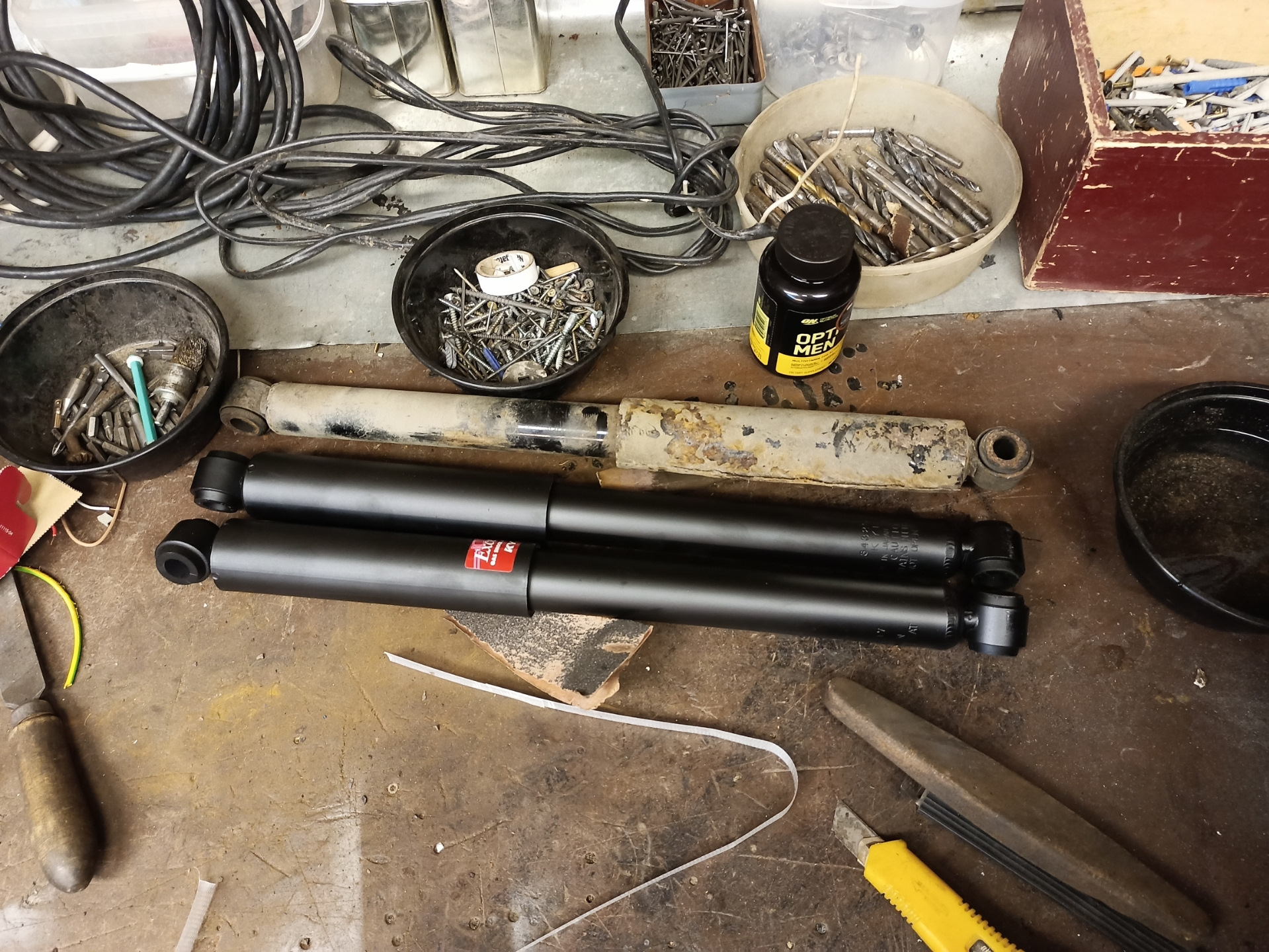 а так серьги и стяжки оставил старые, хотя сейчас бы взял все новое. Рессоры куплены зимой Импресс. амортизаторы красные каябы 343251, хотя родные ничем не хуже, только верхние стаканы сгнили, а так даже резинки целые, оставлю в запас, надо подумать что можно со стаканами сделать.