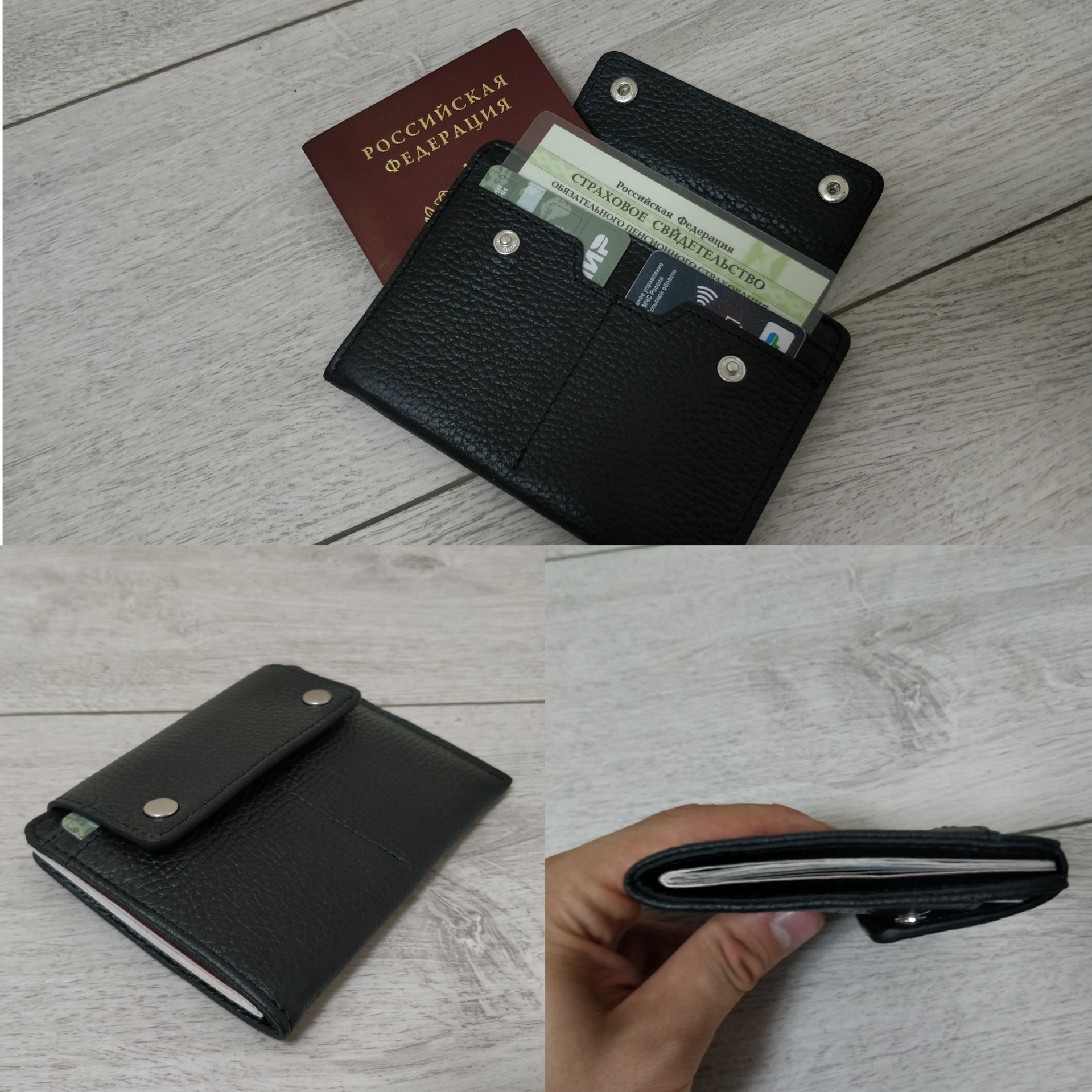 Кроме отделения для паспорта имеются карманы для хранения документов, купюр и карт (2 отсека для пластиковых карт и 2 кармана побольше для свидетельства о регистрации автомобиля, СНИЛС или купюр)