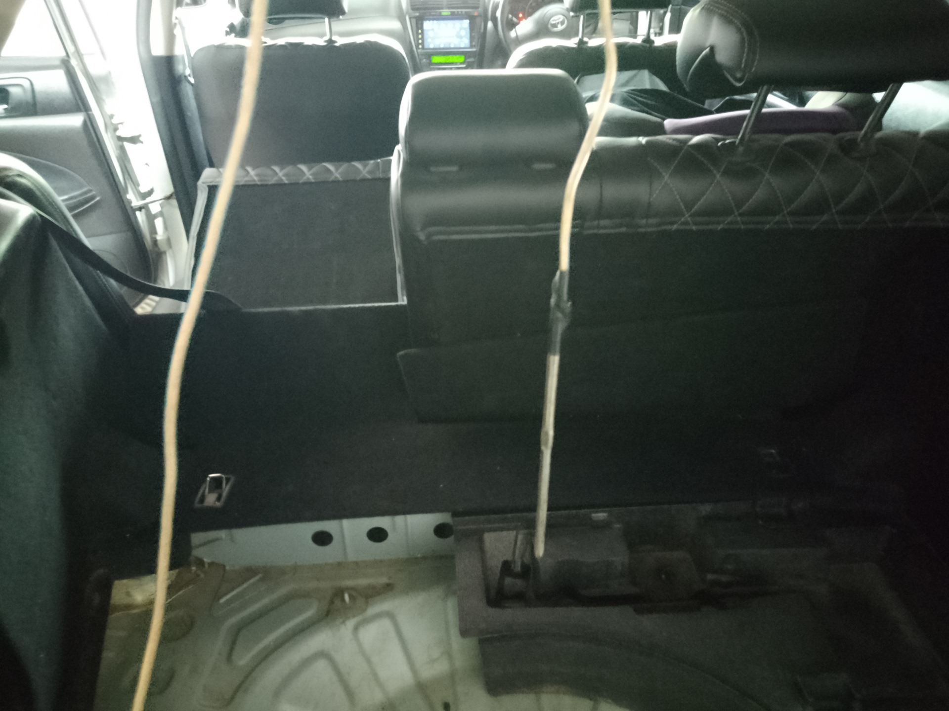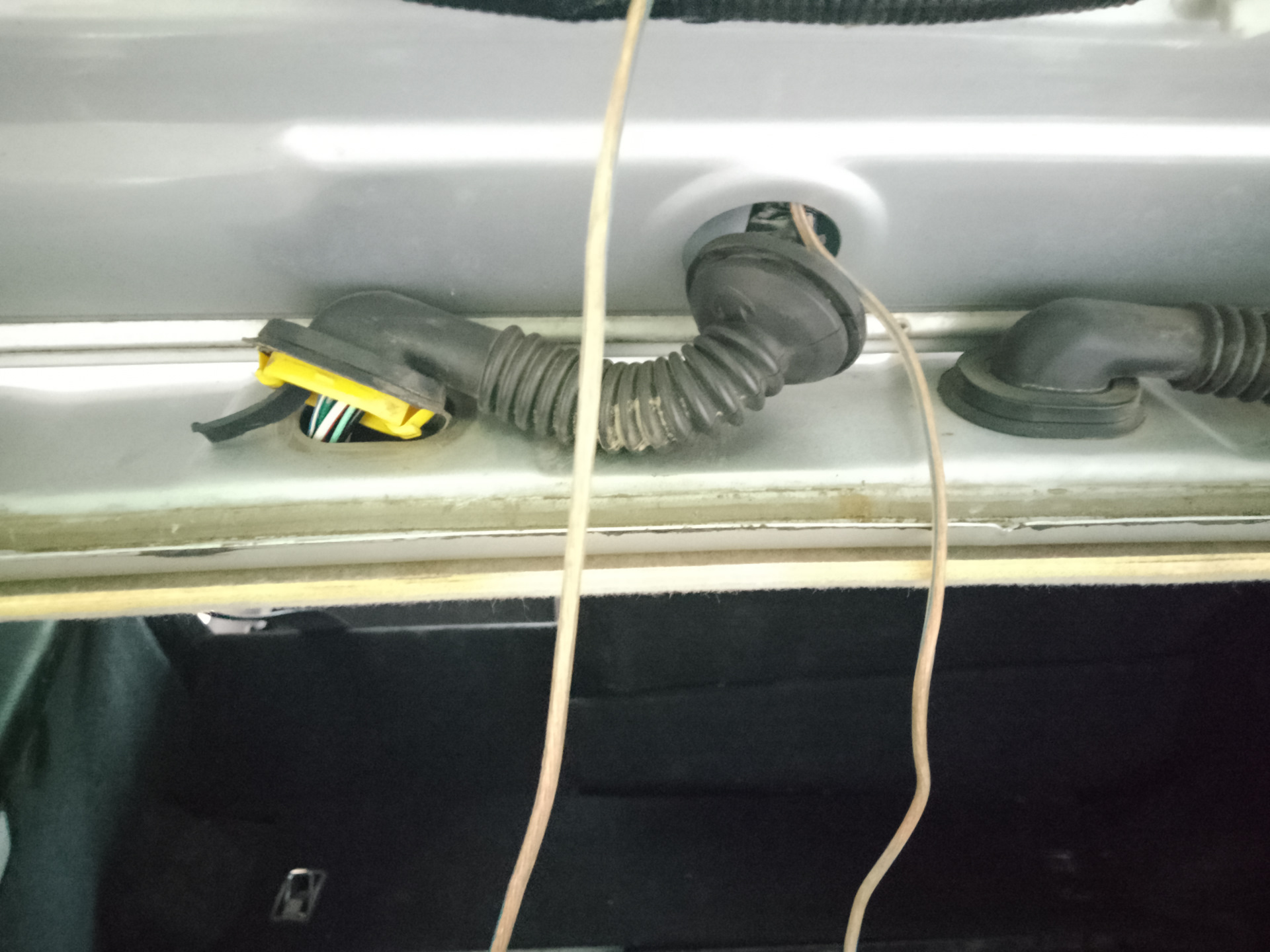 С помощью такого сложного приспособления проводим провод по левой гофре крышки багажника и крыши и далее под обшивкой багажника и левого крыла ведём этот провод к задней средней части ванны