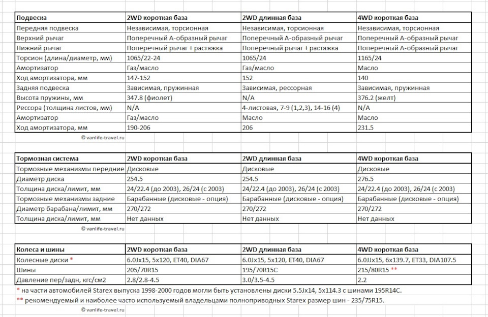 Спасибо что даже не поленились скинуть хороший понятный лист с данными. Но! Даже на этом листе информация противоречит моей ситуации. У меня 2 wd лонг, длинная база и год выпуска 2007 и под исключение указанное в примечаниях не подходит, так как у меня радиус именно 15. Мало того, у меня ведь самые наверное распространенные диски на старексах, самые обычные. И именно они никакие не 5х120, а 5х114,3. Так что нужно в этот документ внести и такое примечание