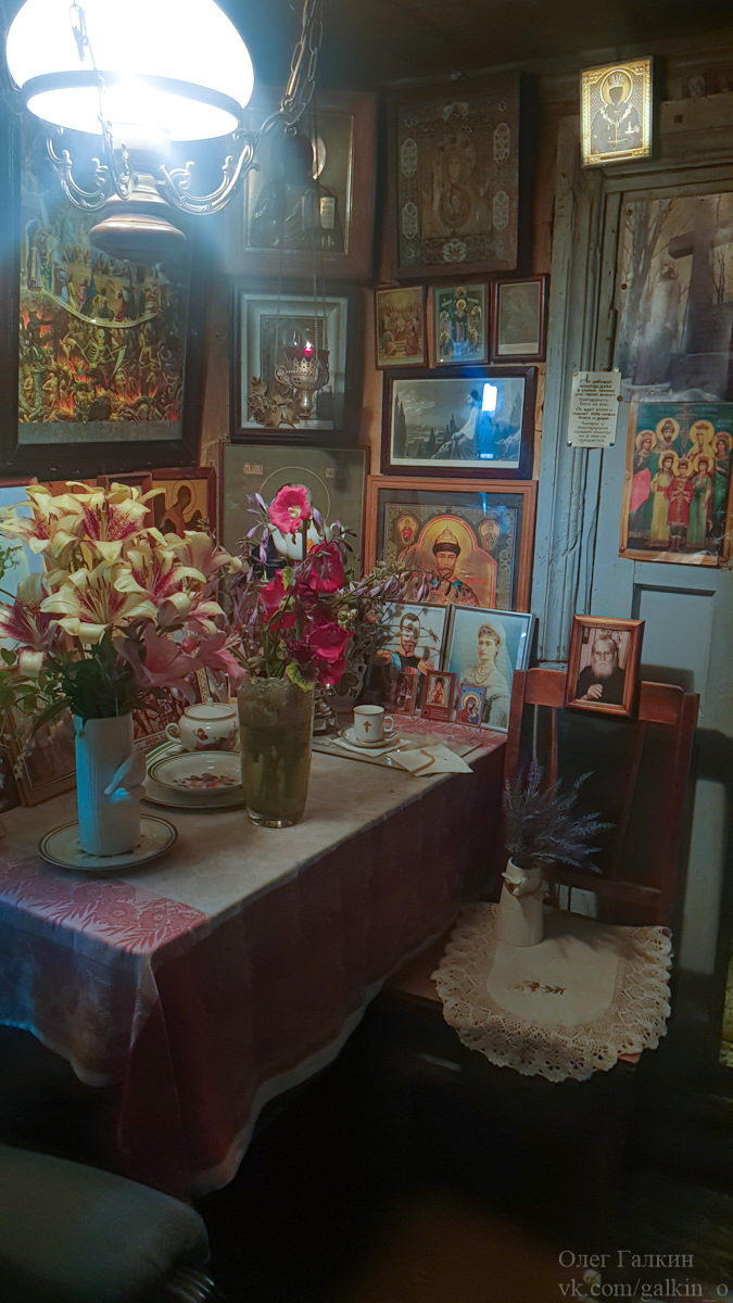 В доме много икон, стоят живые цветы. Светлая атмосфера.