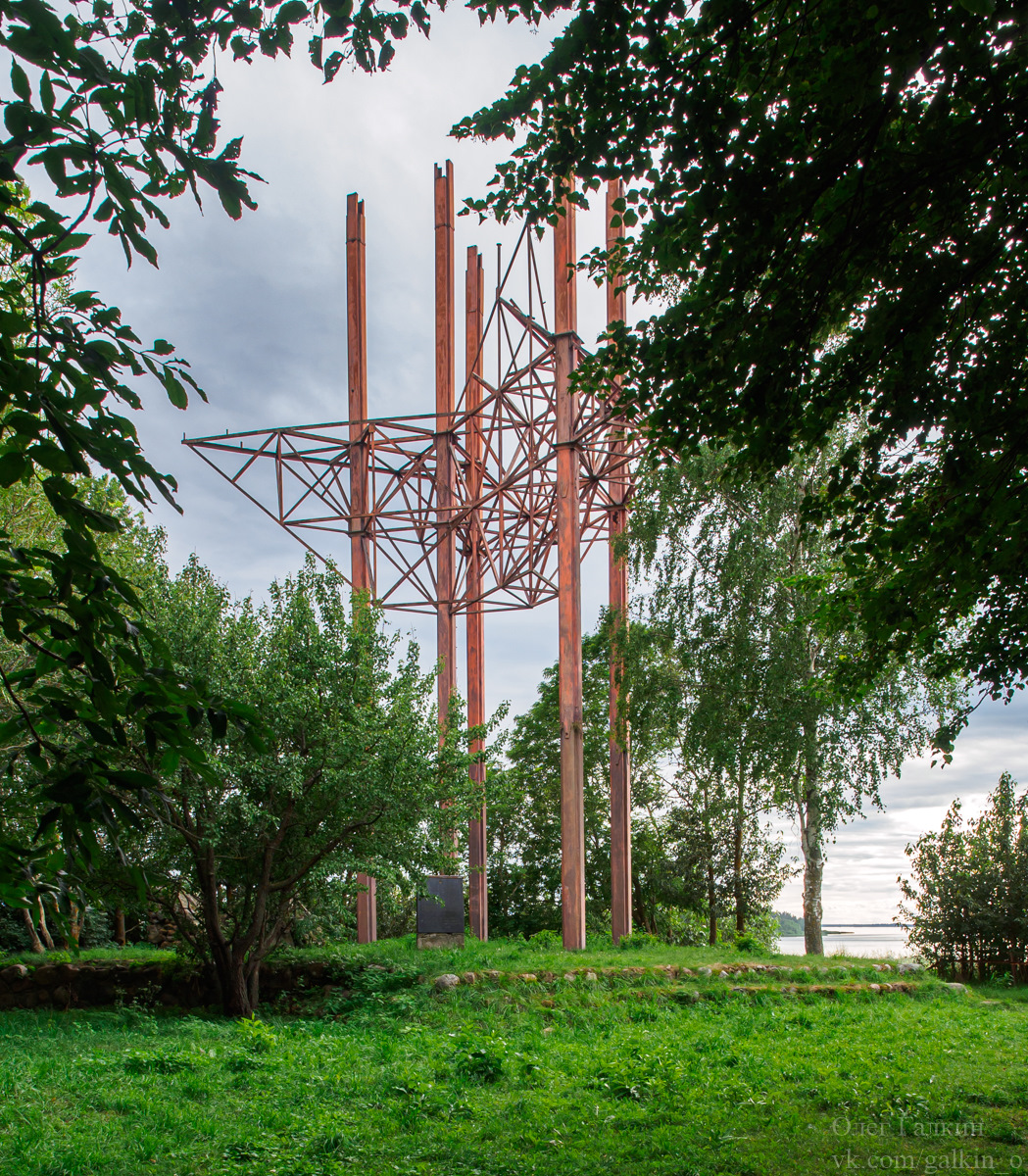 От этого памятника и чуть дальше с отвесного берега открывается завораживающий вид на Псковское озеро и другие два острова архипелага Талабских островов — остров Талабенец и остров Верхний (остров им. Белова).