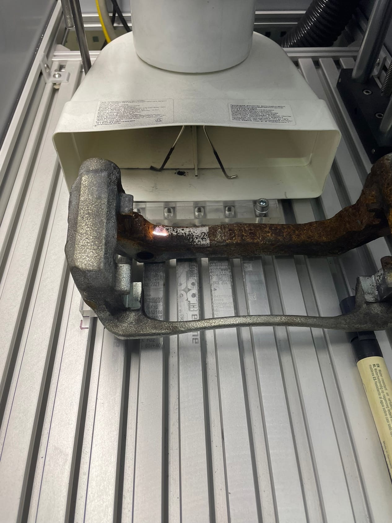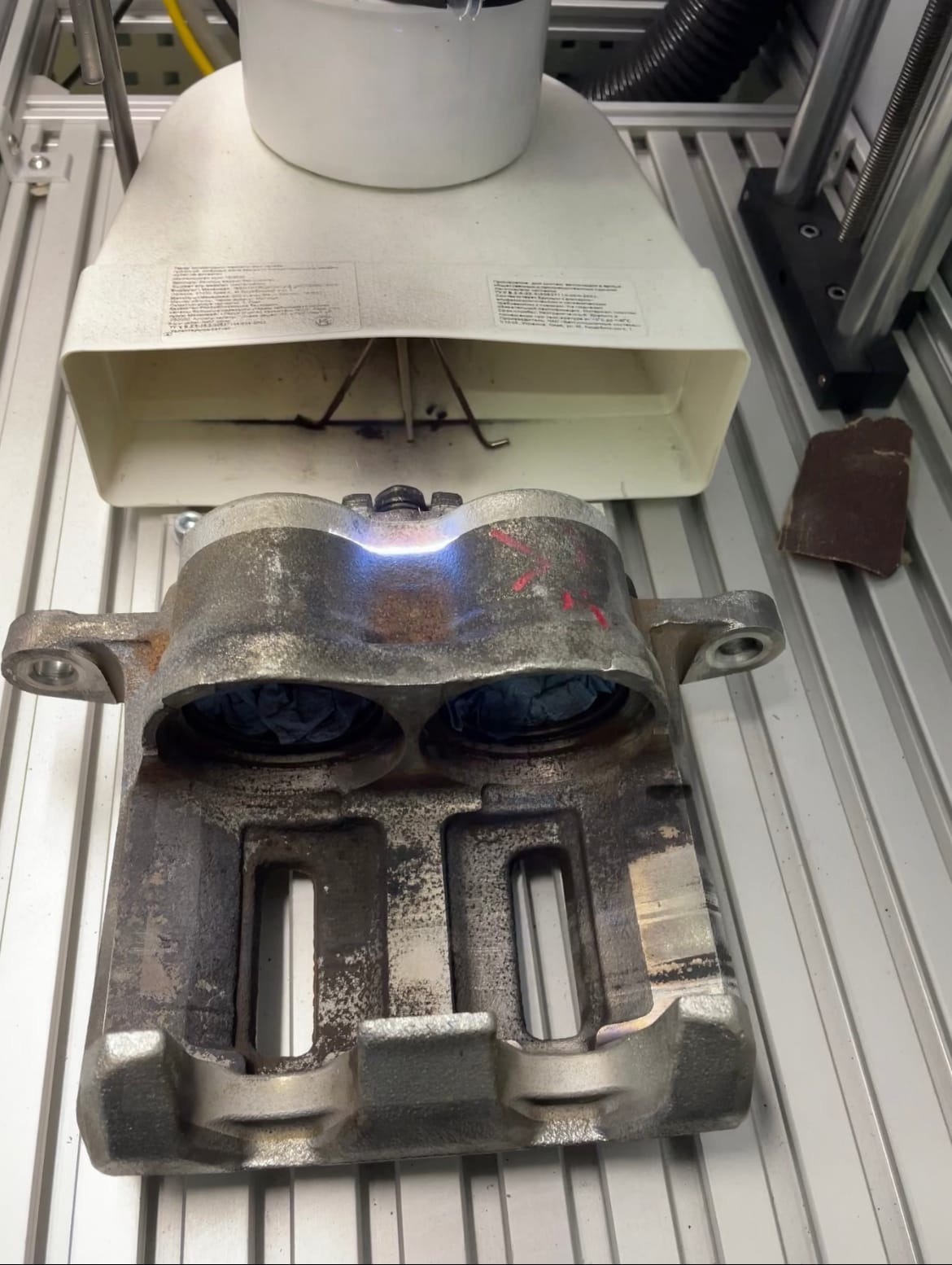Следующим этапом была очистка суппортов от продуктов износа колодок и от ржавчины, сначала я прошёлся железной щёткой с шуруповёртом, потом маленькой железной щёткой, дальше удалял сильный нагар и ржу лазером, чистил так же лазером, труднодоступные места очищал мелкой щёточкой. Ничего сложного, но долго и геморно, проще отпескоструить, но пескоструя у меня под рукой не было)))