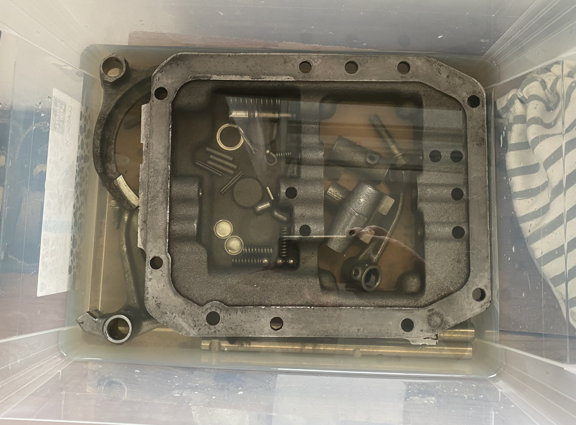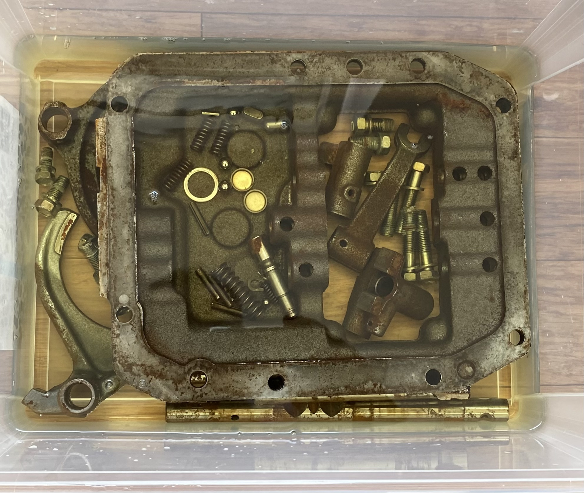 Разобранные детали складываем в ящик и заливаем раствором Evapo-Rust