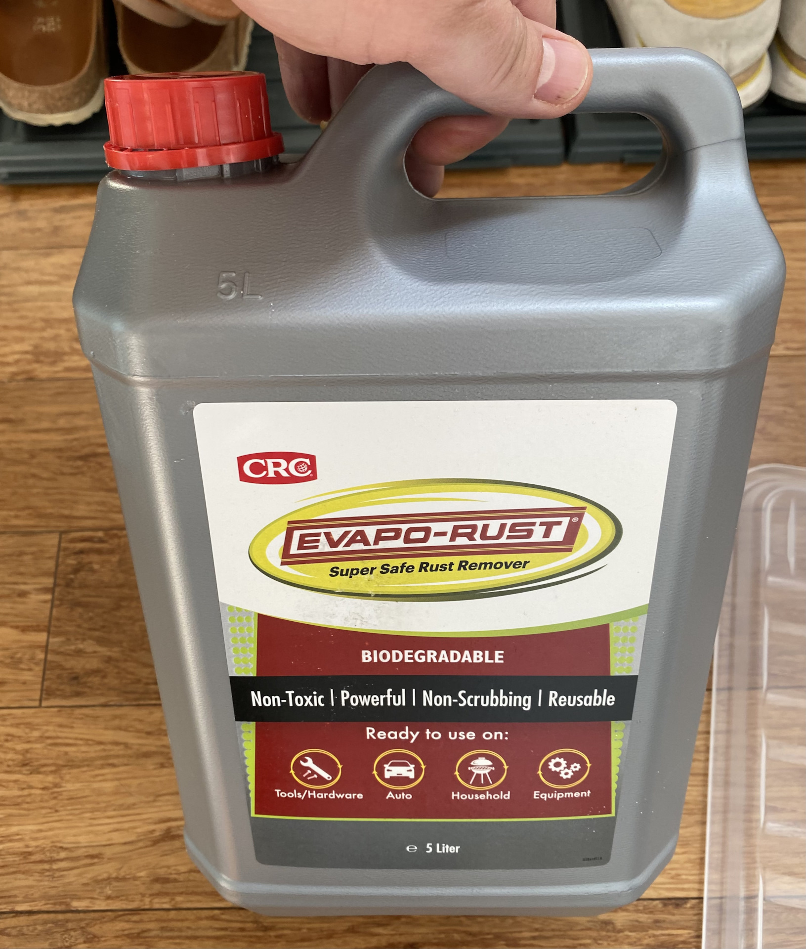 Evapo-Rust. Раствор для удаления ржавчины — бережно, не разрушая резину, пластик и сам металл. Раствор не опасен для рук (минут 15 я работал без перчаток, в принципе не агрессивно для кожи), можно использовать много раз (становится темнее, но продолжает работать, просто используем раз за разом), безвреден для природы (после многократного использования можно выливать в канализацию или даже поливать цветы).