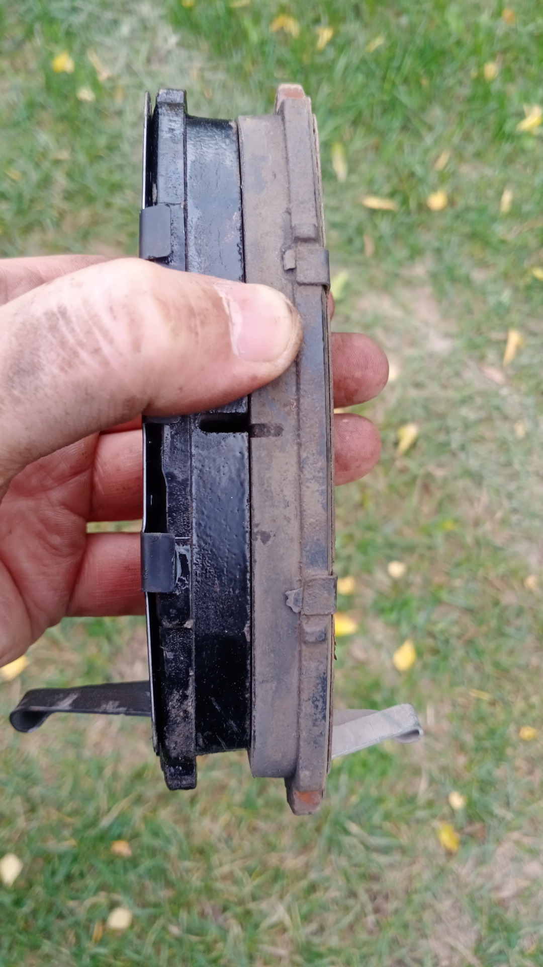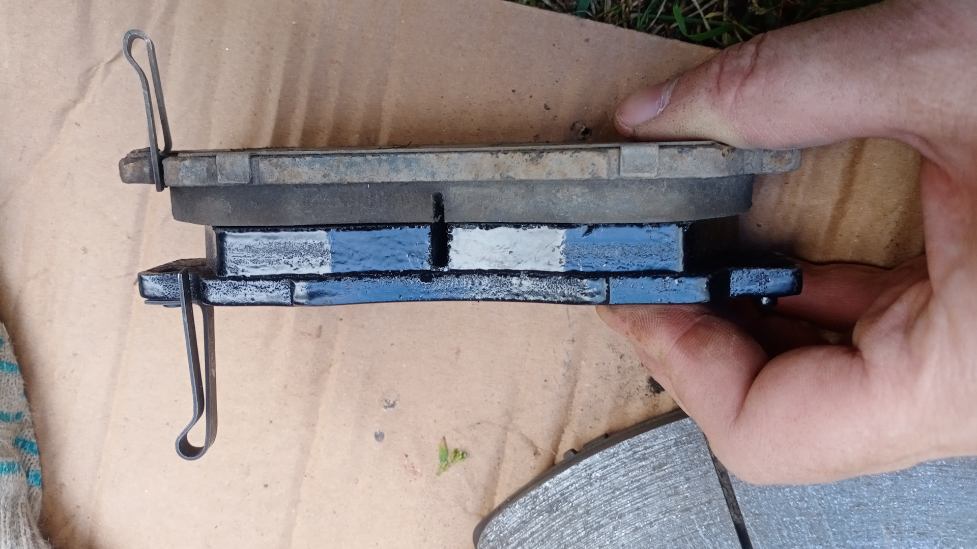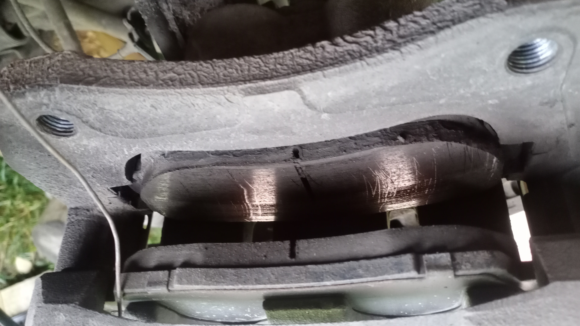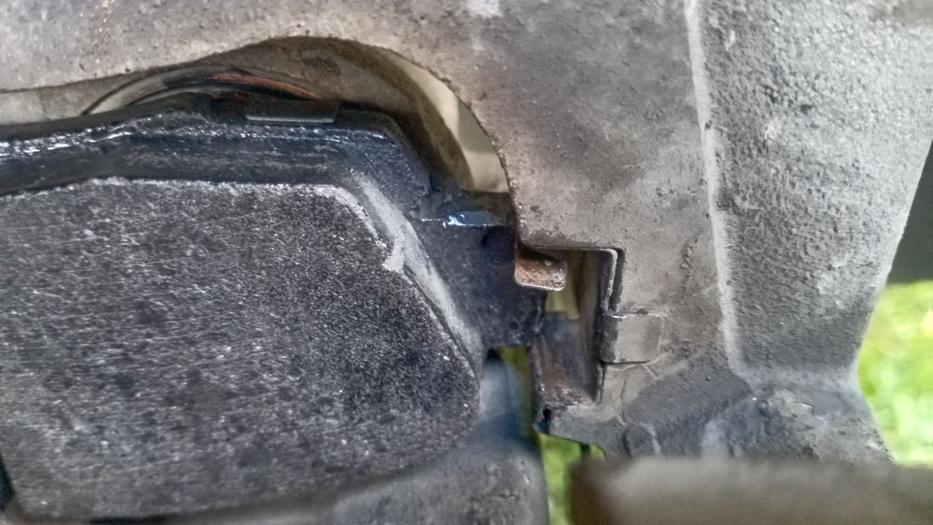 А вот со вторым суппортом начались свистопляски… 💃🕺Не лезет колодка, которая с пружинкой индикатором износа, в штатное место. мучился несколько минут . потом решил примерить к родной колодке. Заметил, что ушки шире, чем у родной. И почему то именно на эту колодку плохо одевалась, и, соответственно, плохо держалась противоскрипная пластина, в добавок противоскрипная пластина упиралась в пружинку индикатор износа… Офис ведро про в 50 км от меня, один суппорт переобул. Что делать? Пошел, вытянул переноску, достал болгарку. И подточил ушки… Вроде все хорошо… 🤗🤗😄😄😄Да ничего хорошего. 😡😡😡Колодка встала на место, но оказалась впридачу ещё и короче… 🤬🤬🤬Что делать? Решил оставить родную одну, вторую установил новую.🥺🥺🥺