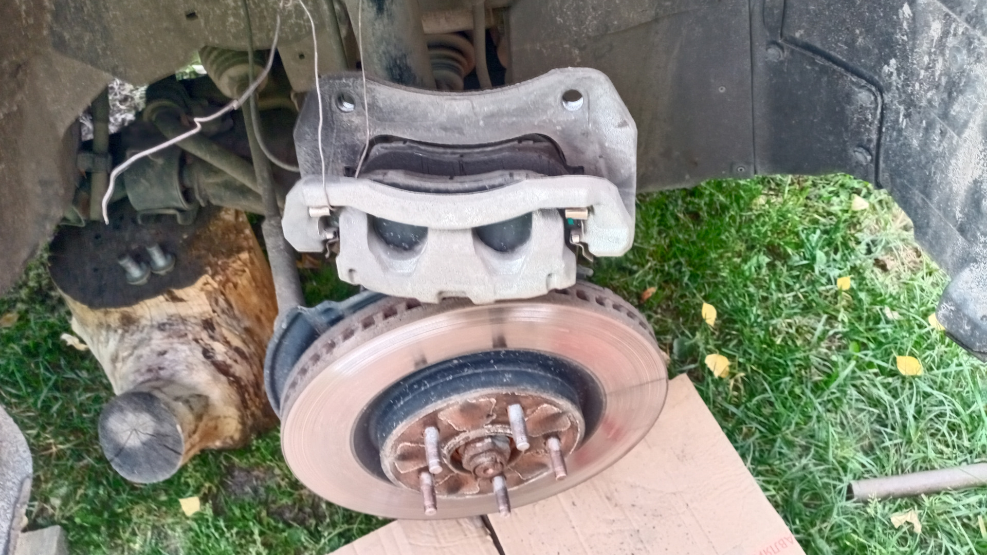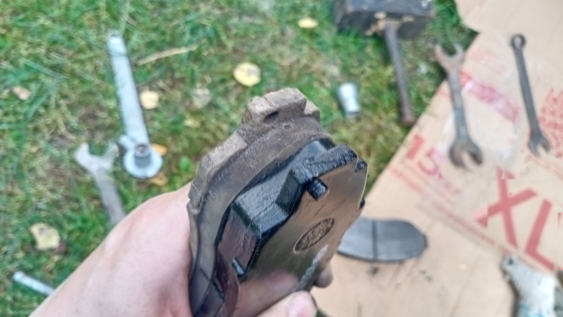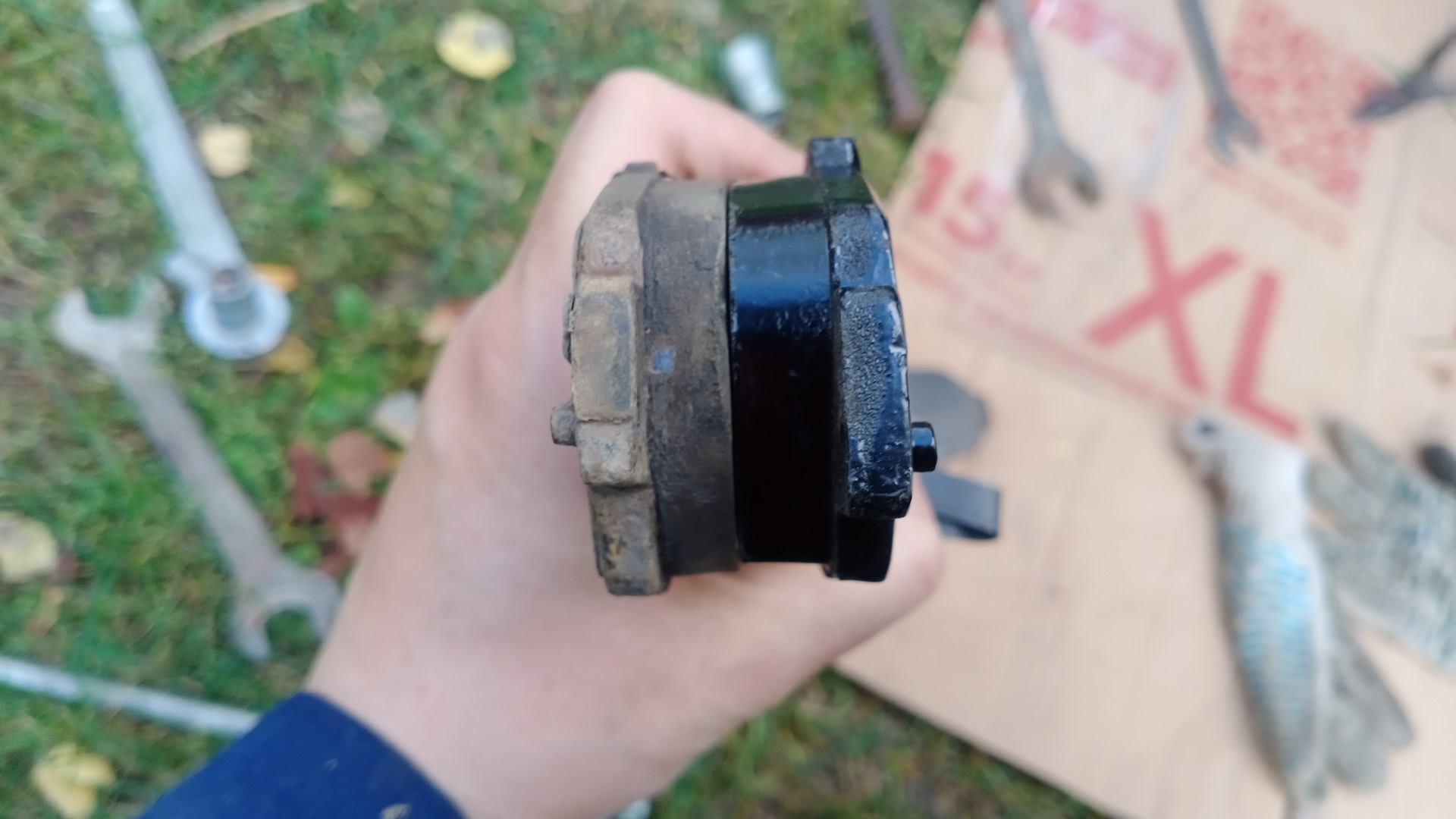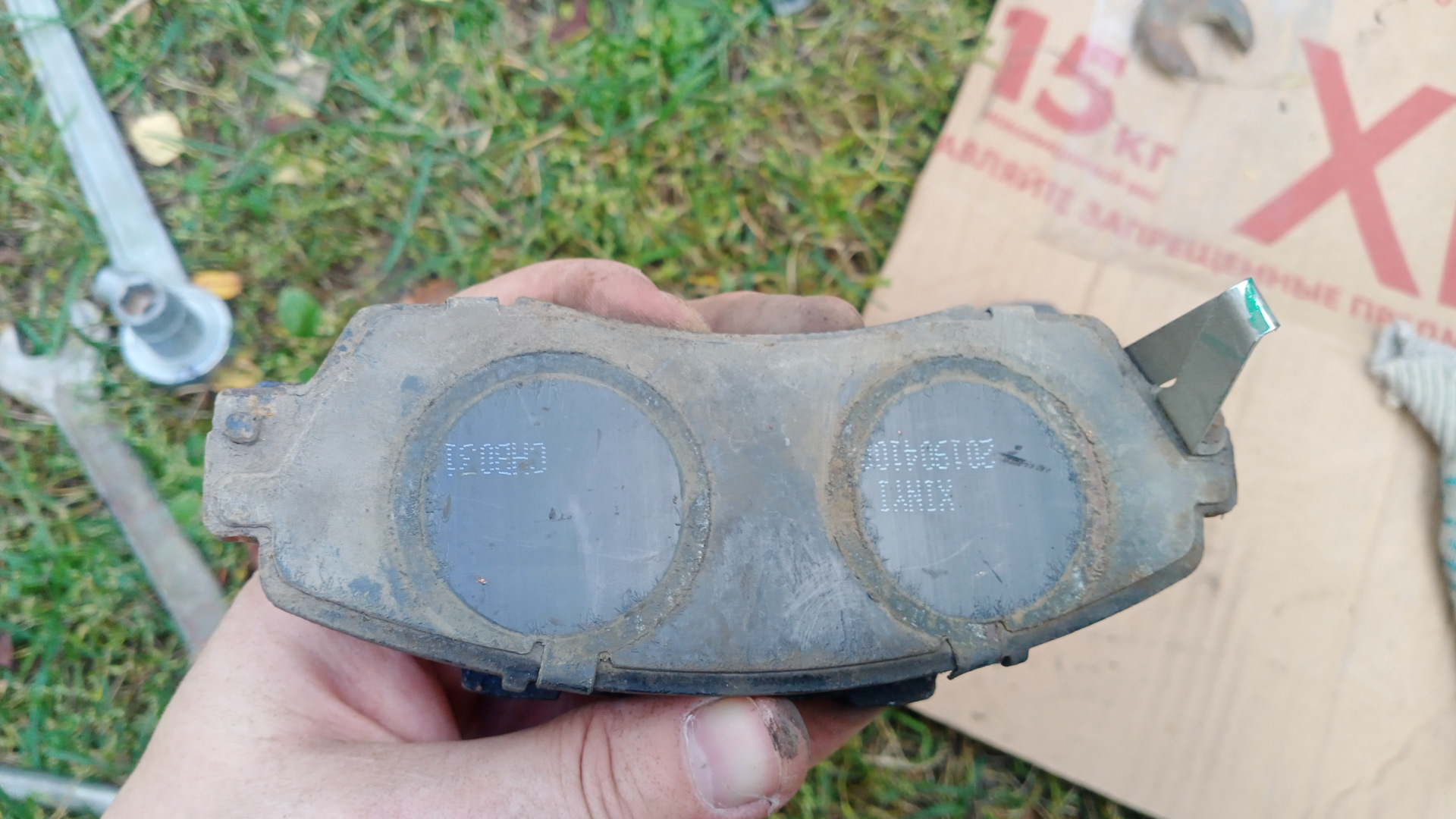 А вот со вторым суппортом начались свистопляски… 💃🕺Не лезет колодка, которая с пружинкой индикатором износа, в штатное место. мучился несколько минут . потом решил примерить к родной колодке. Заметил, что ушки шире, чем у родной. И почему то именно на эту колодку плохо одевалась, и, соответственно, плохо держалась противоскрипная пластина, в добавок противоскрипная пластина упиралась в пружинку индикатор износа… Офис ведро про в 50 км от меня, один суппорт переобул. Что делать? Пошел, вытянул переноску, достал болгарку. И подточил ушки… Вроде все хорошо… 🤗🤗😄😄😄Да ничего хорошего. 😡😡😡Колодка встала на место, но оказалась впридачу ещё и короче… 🤬🤬🤬Что делать? Решил оставить родную одну, вторую установил новую.🥺🥺🥺