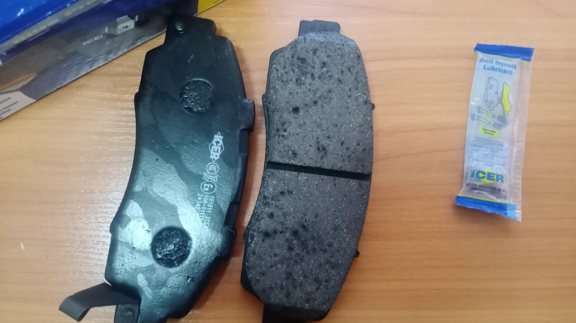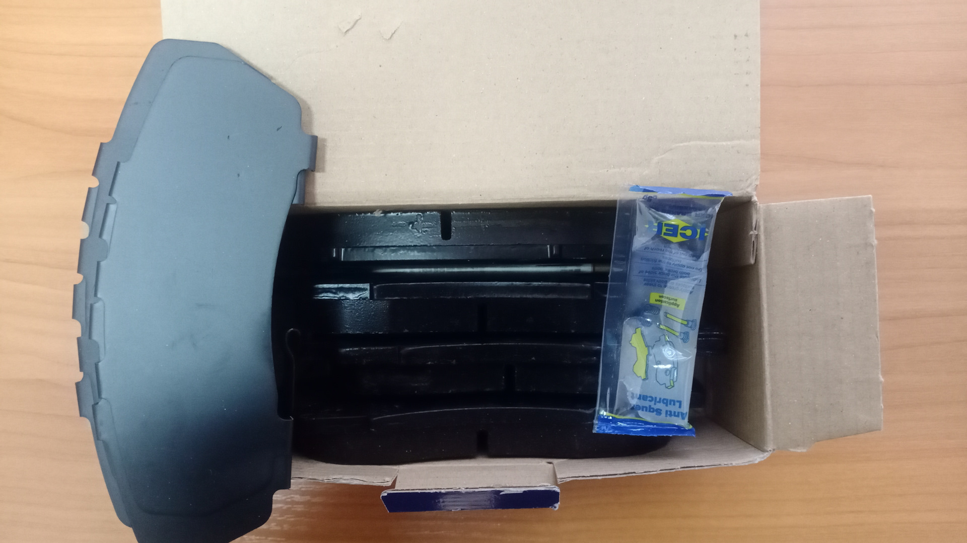 Пришли колодки. 🚶Внешне всё нормально. 🧟Колодочки передние в комплекте: колодки, противоскрипные пластины, инструкция и лубрикант; колодки задние — сами колодки, винтики со смазкой синей на резьбе, инструкция и лубрикант. Один суппорт переобул. Все встало на штатные места.🦸