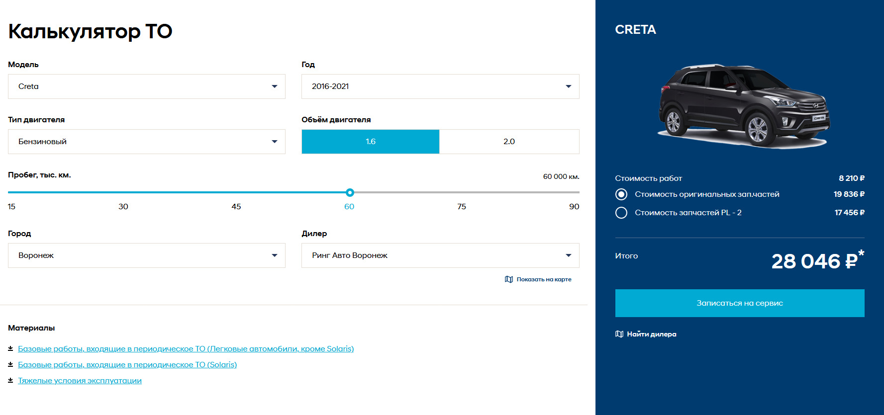 Таким образом, вместе с запчастями То-4 обошлось 10 651,5 рубля. Если приехать без запчастей и скидок, по калькулятору ТО Хендэ у того же дилера обойдется 28 000