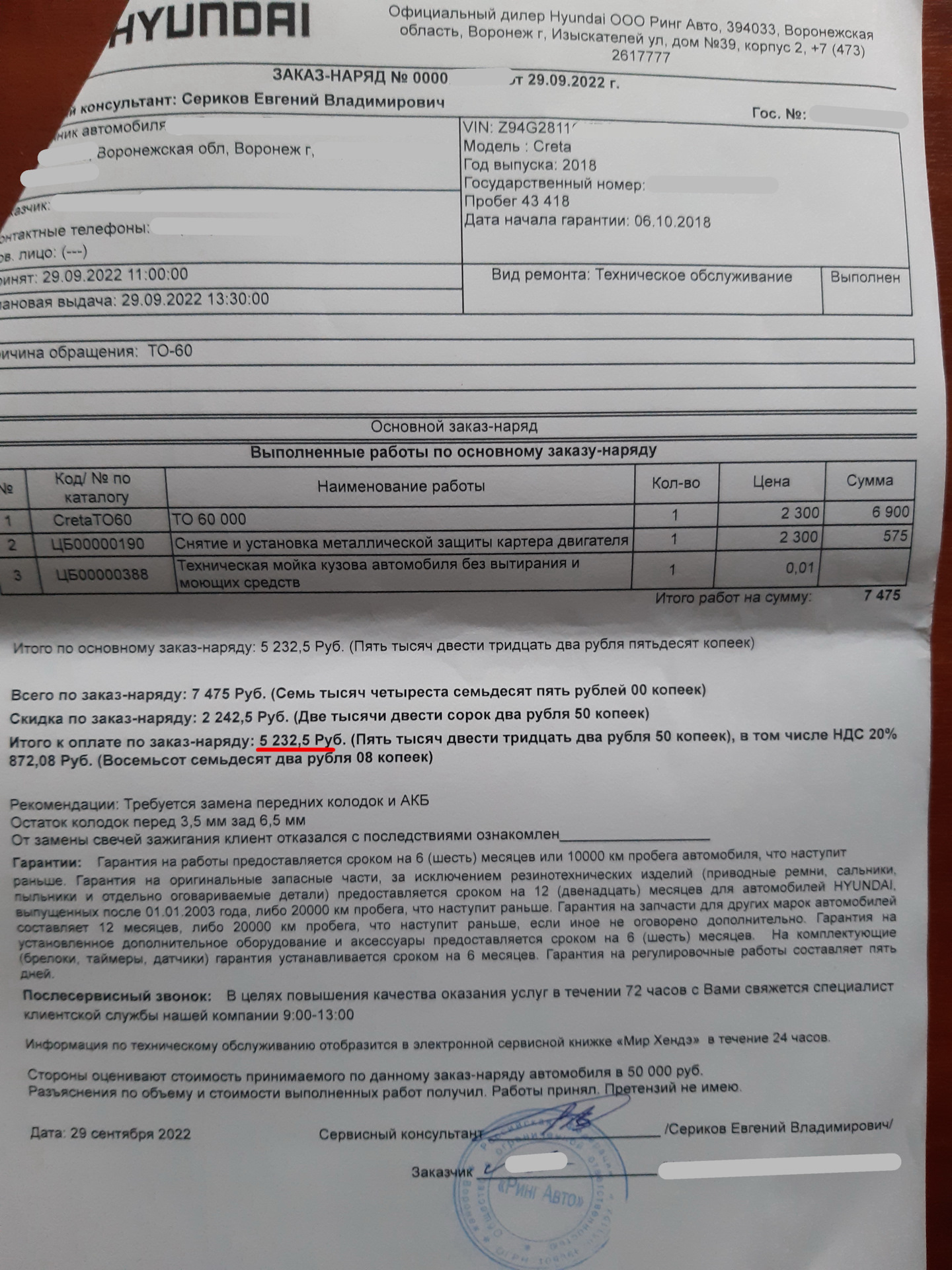 По нынешним временам действительно приятное и актуальное предложение. Скидку без вопросов сделали, в итоге после удаления всей лишней чепухи стоимость ТО составила 7475 р без скидки и 5232,5 рубля по факту.