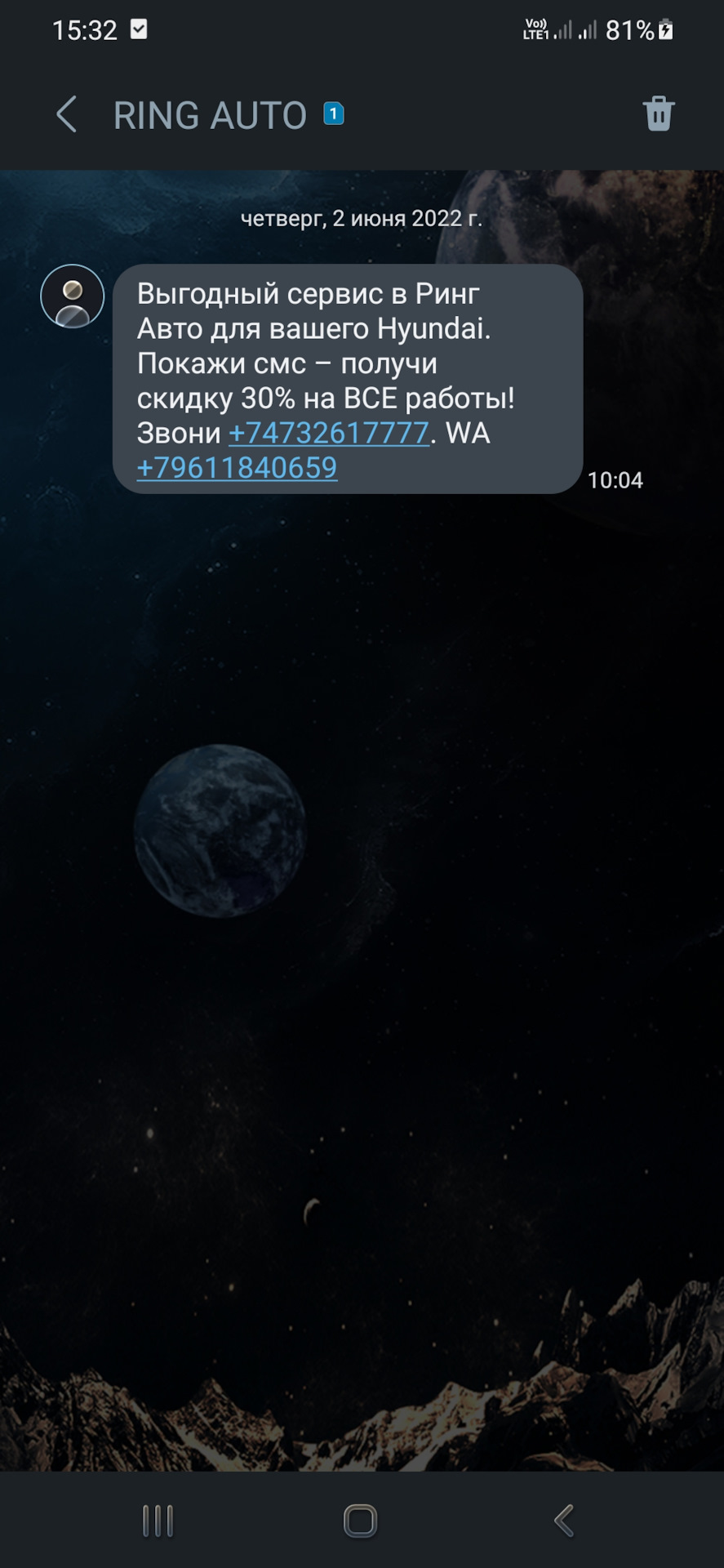 А ещё в июне Ринг Авто прислал мне смс с предложением о скидке 30% на все работы