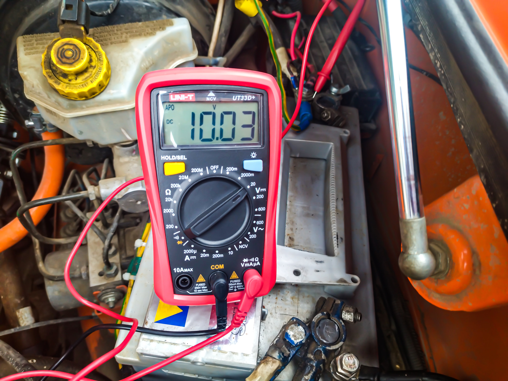 Установив его на машину, сделали фото для подтверждения, что он разряжен и на мультиметре зафиксировали 10в. При этом я попробовал завести «Рыжего», но максимум загорелась приборка, при повороте ключа конечно же даже втягивающее реле не щелкало.