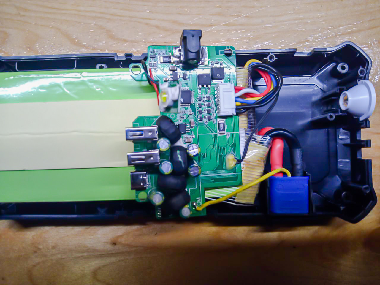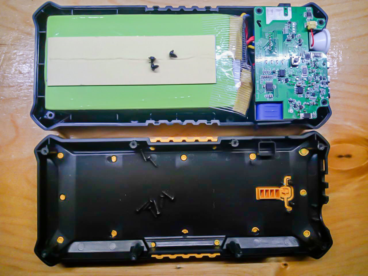 Начали, конечно же, со вскрытия устройства. Оно показало отличную аккуратную сборку. Четыре литиевых банки, они приклеены надежно к корпусу устройства. Плата установлена ровно, элементы припаяны хорошо и ровно. Следов не отмытого флюса нет и все выглядит чисто и аккуратно. Поднимать банки и плату не стали, удовлетворили свое желание беглым осмотром.