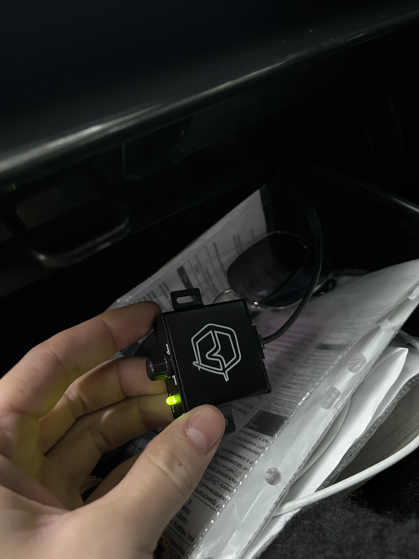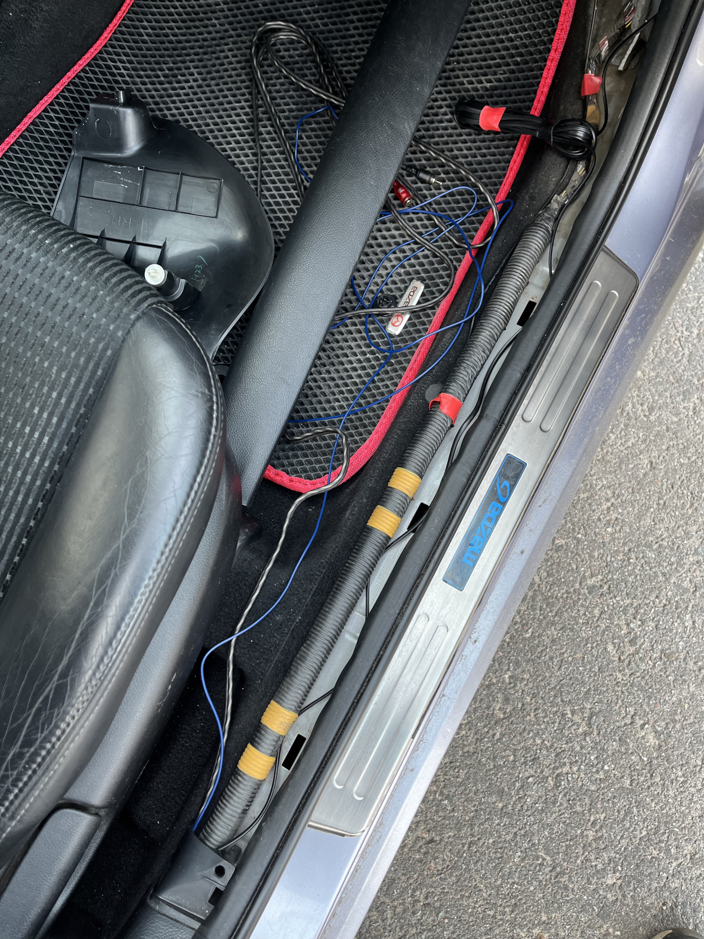 2️⃣ Провода с тюльпанами, регулятор баса и провод REM провел через правый порог, за бардачок и к магнитоле.