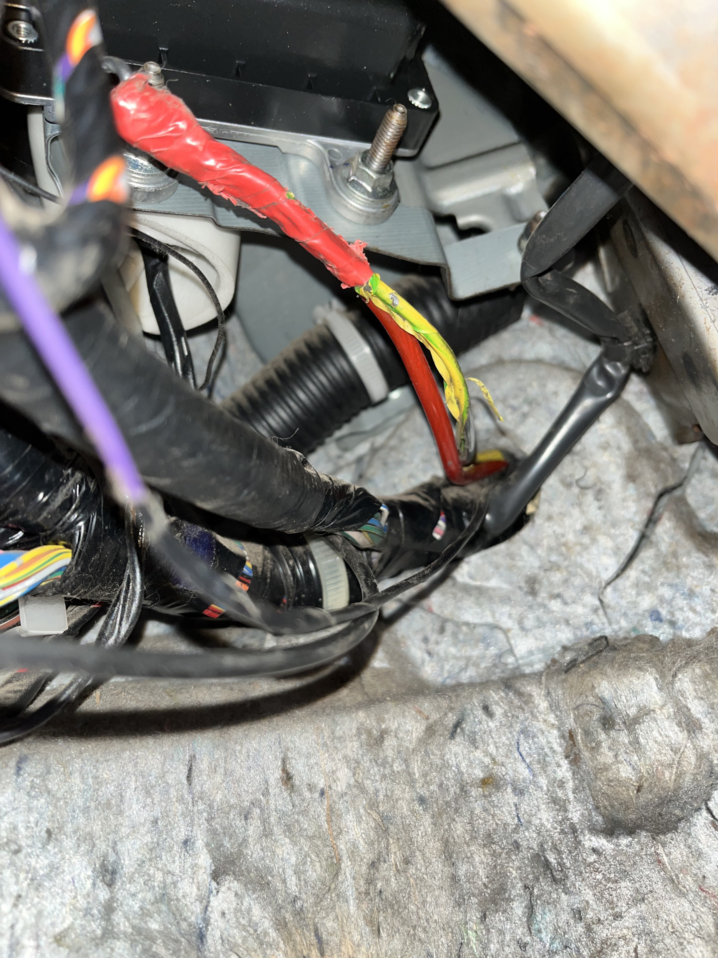 3️⃣ Плюсовой провод тянул через заглушку с косой проводов с помощью проволоки, выйдет в районе педали СЦЕПЛЕНИЯ( на МКПП 😅)
