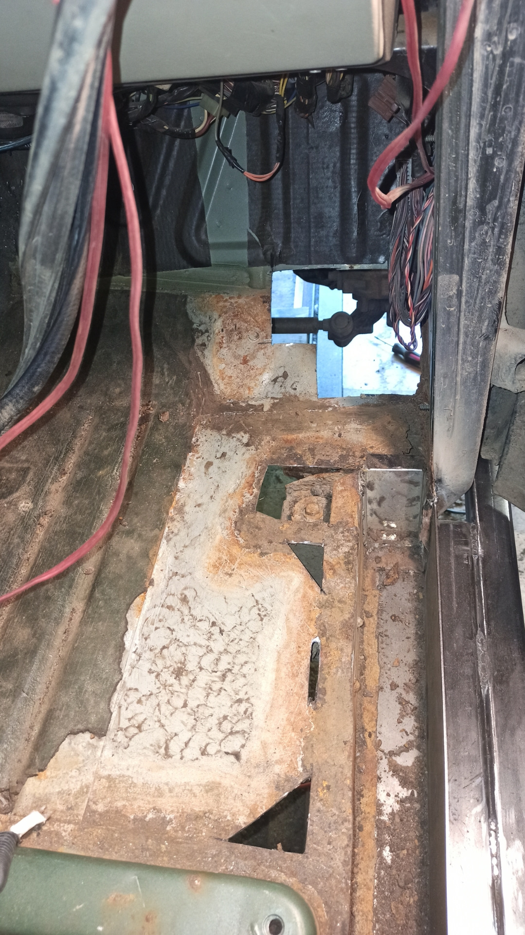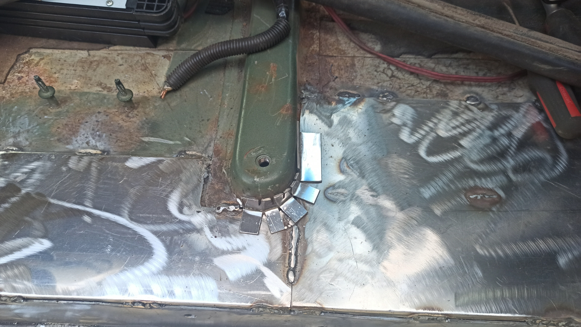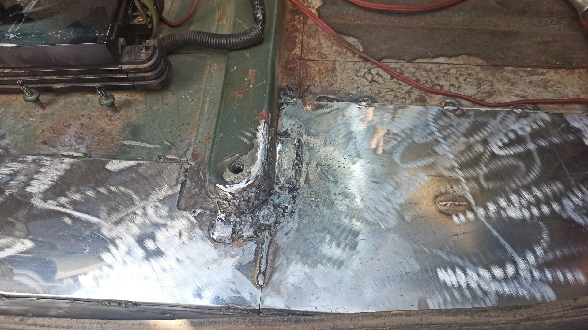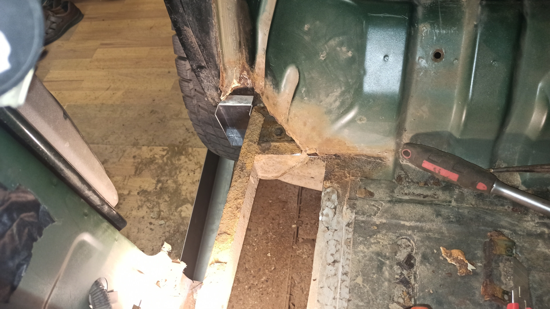 Пороги прогнили очень сильно. Для их внешней основы я заказал уголок с полками 100 на 60 мм, длиной 1500 и толщиной 2 мм. Срезал остатки старых и подогнав по месту приварил новые уголки. Я думаю с запасом. В качестве подножки порога решил использовать сдвоенную квадратную трубу 40х40х2 мм. Забежав вперёд скажу что идея полностью оправдалась. Подножка получилась вполне эстетично и функционально. Хорошая прочная ступенька. В качестве металла для латания полов использовал 2 мм нержавейку. Не могу сейчас точно сказать её название но она явно не пищевая. Магнитится, хорошо варится полуавтоматом и неплохо красится. Позаимствовал её отходы у себя на работе 🤫. Если кому интересно то узнаю полное название сплава. Я практически все свои самоделки делаю из него. Кто читает мой БЖ убедится, все кронштейны из него.