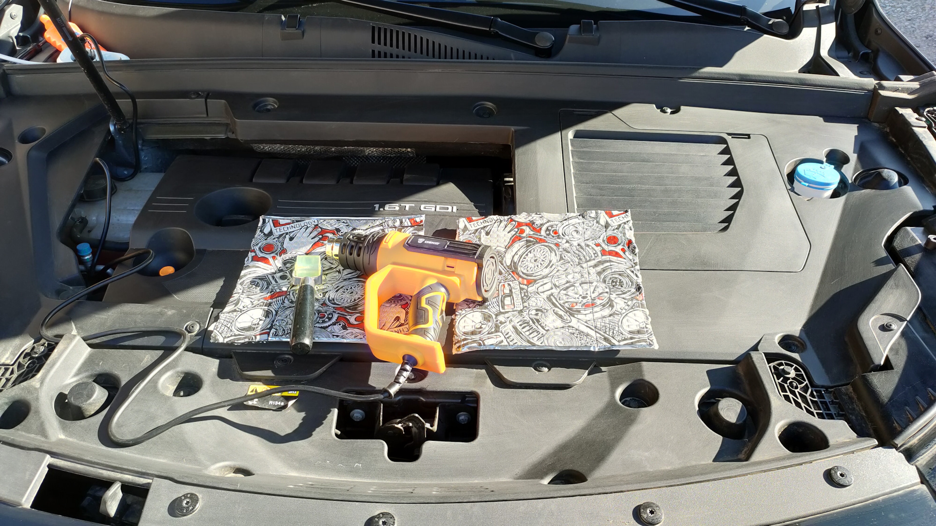 Но тут же вылезла еще одна жопка: резкий металлический щелчок замка капота при захлопывании, он прям стал выделяться. Думал надеть на петлю подходящую пластиковую втулочку, или несколько слоев кембриков — да не тут-то было… Петля несъемная, она приварена :( Попробовал намотать на нее изоленту — работает, но изолента рвется защелкой замка, и уже на третьей итерации эффект пропадает… Похоже, с замком бесперспективно :(