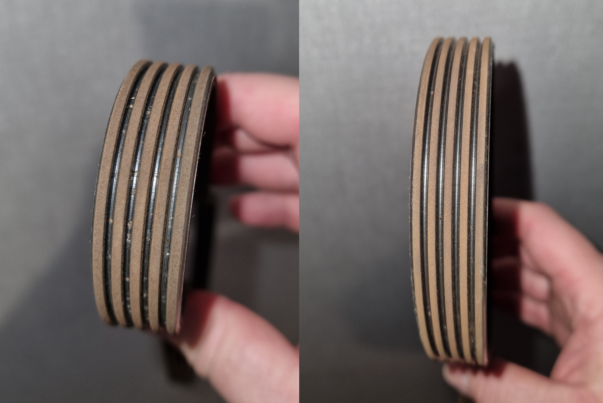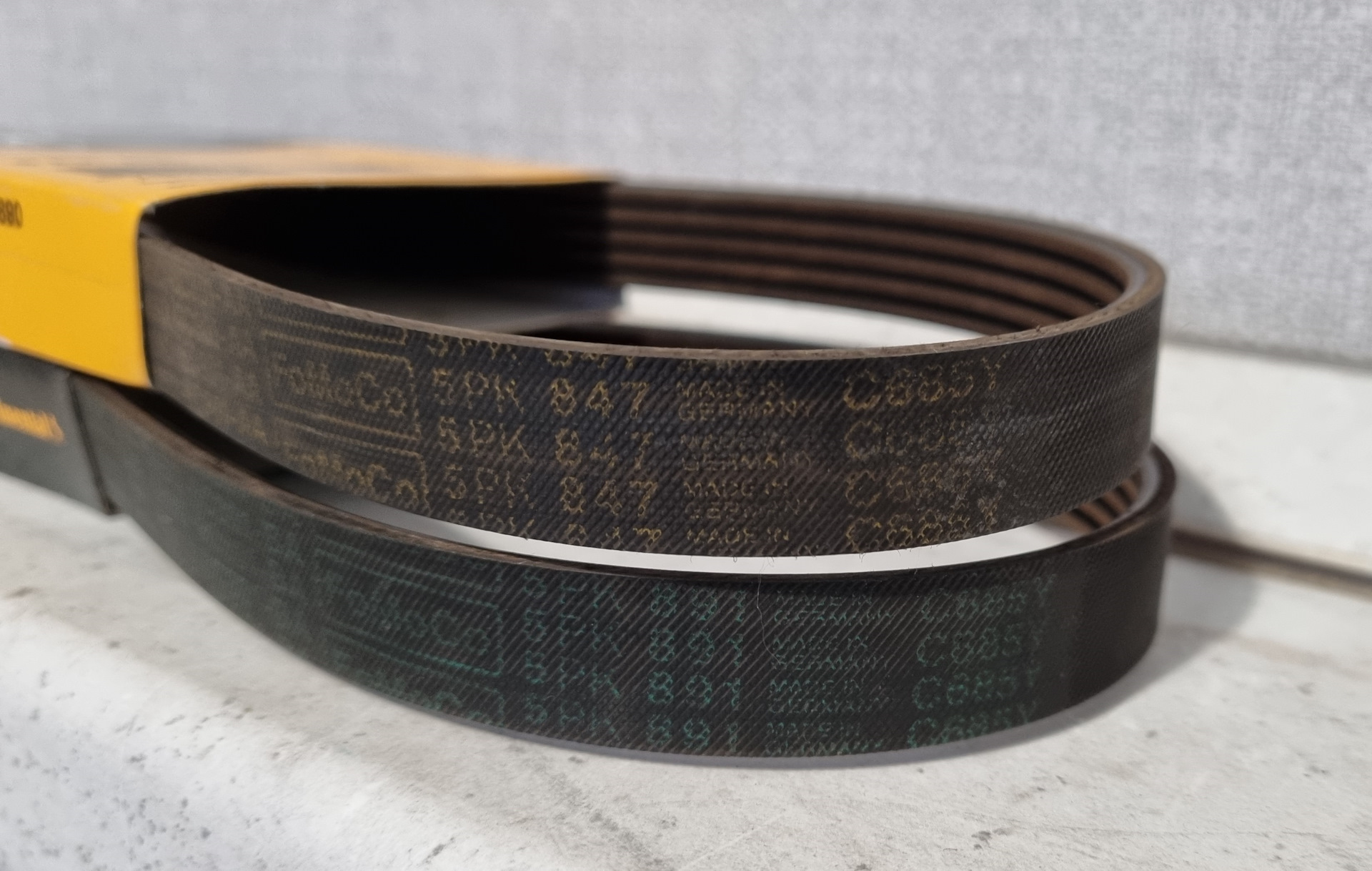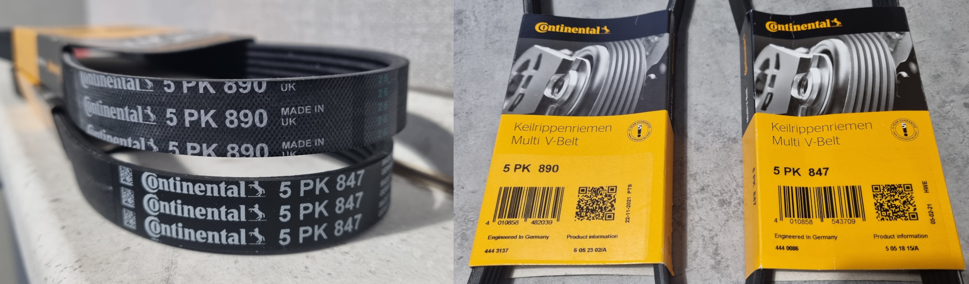 Несмотря на длительный летний отпуск, всё же оперативно накатал очередные пять тысяч километров, и настало время делать небольшое ТО. Так как пробег подошел к 70, а на носу ещё и зима, то решил добавить некоторые операции, которые, возможно, стоило сделать чуть ранее. Например, давно нужно было осмотреть ремни навесных агрегатов. Точно знаю, что на пробеге около сорока тысяч километров предыдущим владельцем менялся сам ремень ГРМ, ведь оригинальному тогда было 12 лет. Был установлен Contitech (артикул CT979). А вот информации о замене ремней генератора и кондиционера никакой не было. На большинстве машин, для оценки состояния ремня достаточно провести несложный визуальный осмотр, потому что всё находится прямо перед глазами, и хорошо доступно. На ST второго поколения, ремни, по большому счёту, не видны. Сначала план был скататься на замену масла, а оказавшись под машиной, уже оценить состояние обоих ремней. Но тратить время на повторные поездки куда-то совсем не хотелось. И вот, однажды вечером, вооружившись фонариком, в небольшую щелочку между патрубками впуска, удалось разглядеть сначала один, а затем и второй ремни. На них не было видно вообще никакой маркировки, что намекнуло мне на то, что на пробеге 40 000 километров их никто не менял вместе с ремнем ГРМ. А это значит, что они уже крутятся больше четырнадцати лет. Ремней, как я уже заметил выше, у нас два. Оба приводят по одному агрегату: один, внутренний, на генератор, один, внешний, на кондиционер. Они даже по длине примерно одинаковые. Ремень генератора (артикул Ford 1 563 258) имеет длину 890 миллиметров, а ремень кондиционера (артикул Ford 1 564 257) — 847. Оба с пятью дорожками. Ремни Ford, честно говоря, не интересовали, так как на опыте недавней покупки фильтров свежих оригинальных запчастей нет. Покупать ремни, которым 4-5 лет от роду, и черт его знает, как они хранились, — очень не хотелось. Поэтому посмотрел продукцию Contitech, Gates и Dayco. Решил приобрести Contitech. Артикулы, соответственно, для генератора 5PK890 и 5PK847 для кондиционера. Пришли относительно свежие ремни 2021 года. По фактуре абсолютно разные, один сделан в Великобритании, второй в Германии.