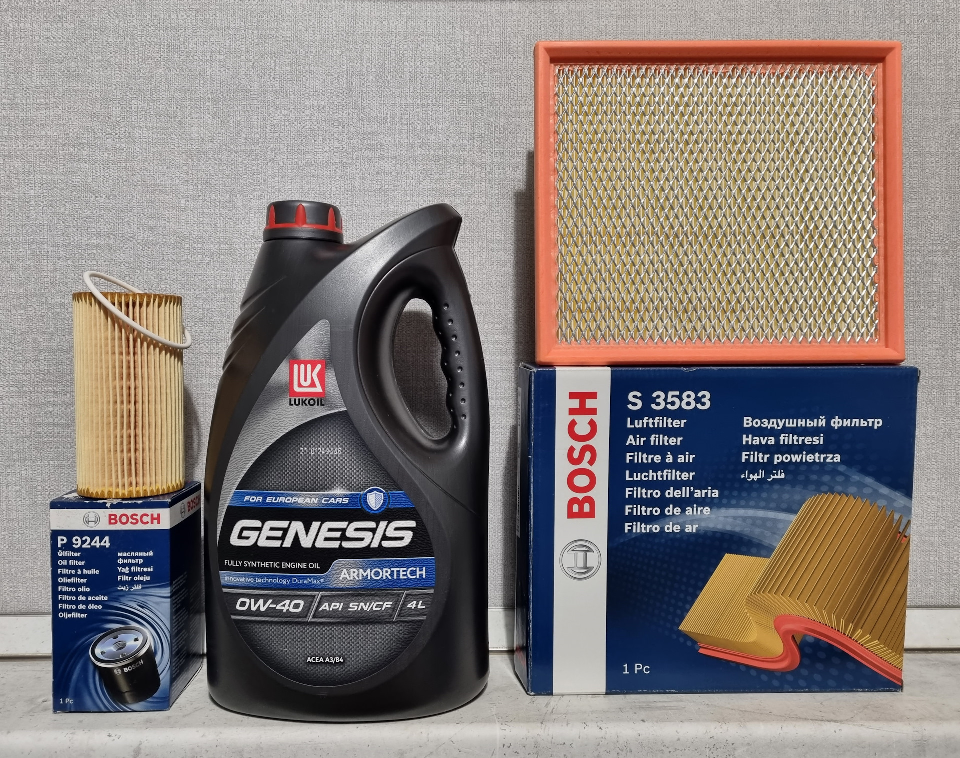 Ну и стандартные процедуры: замена масла (Lukoil Genesis Armortech 0W-40, артикулы 3150660 и 3150665), масляного фильтра (артикул Bosch 1 457 429 244), прокладки пробки поддона двигателя (артикул Febi 22149) и воздушного фильтра двигателя (артикул Bosch 1 457 433 583).