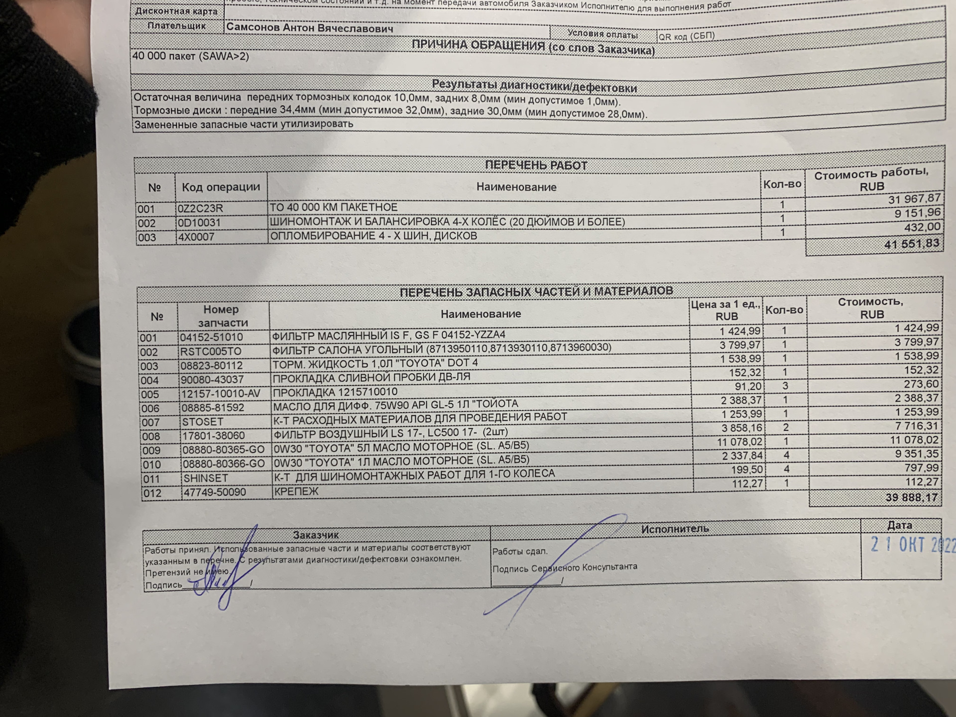 Где-то с 9:00 утра до 14:30 заняли все работы и Сергей передал мне заказ наряд на оплату, который со скидкой стал в 82.000 за работы и 5100 за хранение летней резины на зимовку