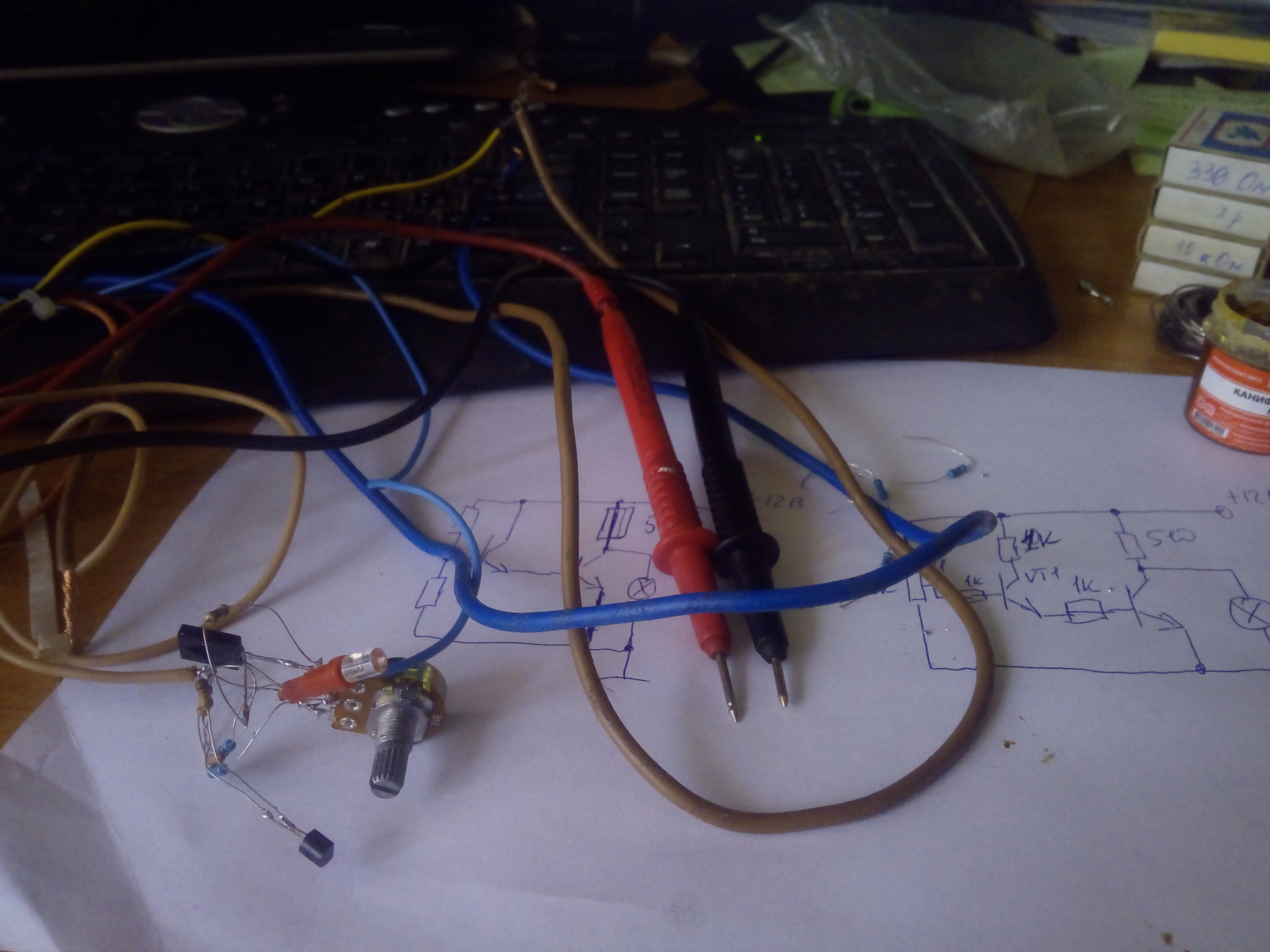 Но это я вам быстро рассказываю как схема устроена и как её собрать. А у меня данный процесс занял времени поболее. Сначала, само собой, были НИОКР и схемка была собрана навесным монтажом в виде вот такого клубка.