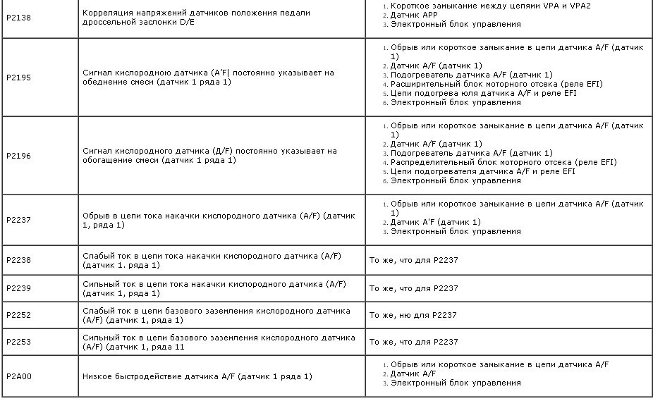 Р2А00 Датчик состава смеси – Возможное местонеисправности (Разрыв или кор.замык. датчика состава смеси, датчик AFS, Нагреватель датчика AFS, Реле EFI M, цепь нагревателя датчика смеси, система подачи воздуха, давление топлива, форсунка, Соединение шланга системы вент картера, ЭБУ.