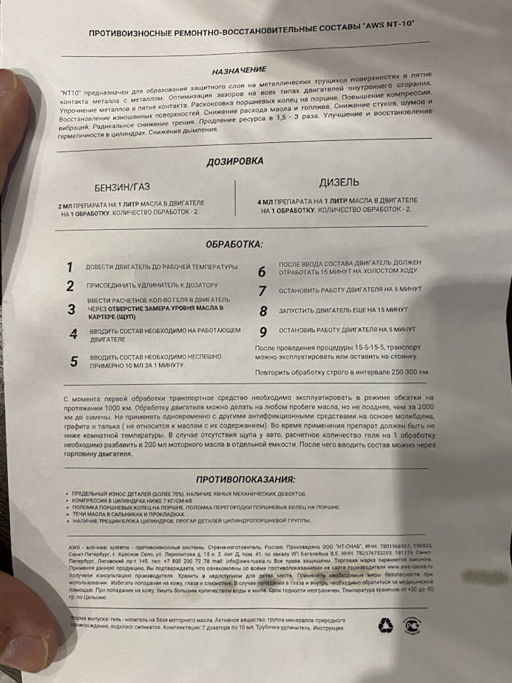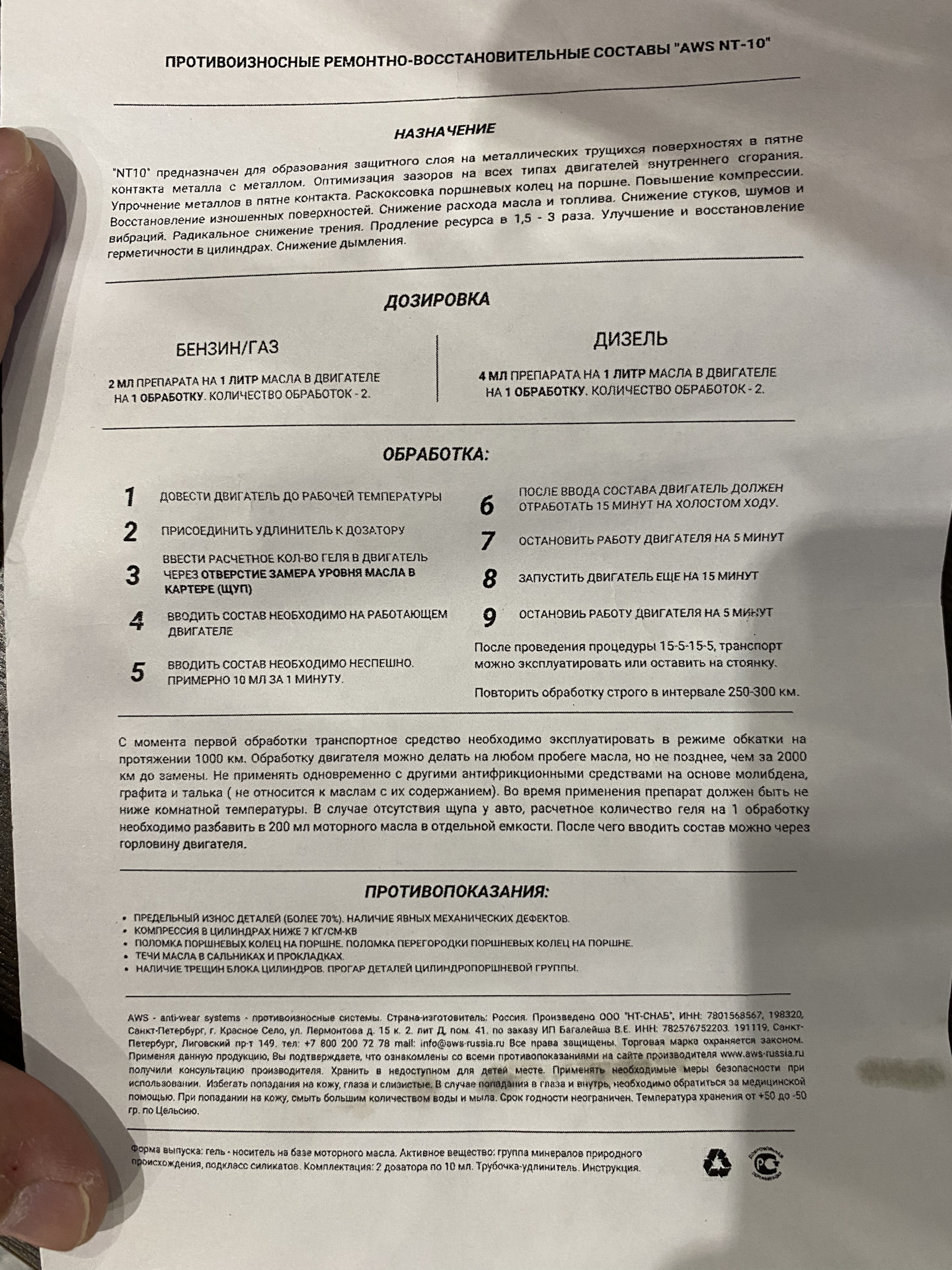 Что могу сказать…ездил я себе да ездил. И на слуху постоянно слышал о присадках…мол залей я лью и все гуд. На пробеге в 133 000 км, звоночки по задирам были, но не так ярко выражены. Решил я все таки залить средство AWS NT-10 Ремонтный состав для двигателя. Сделано все было по инструкции, двигатель стал работать по слуху "эластичней и тише" но на второй день стал проявляться звон, а на третий день молот начался как будто то поршня стали иметь свободное пространство и начали хреначить, как по колоколу (ссылку на видео приложу) Может быть это стечении обстоятельств, может действие средства — думать можно что угодно.