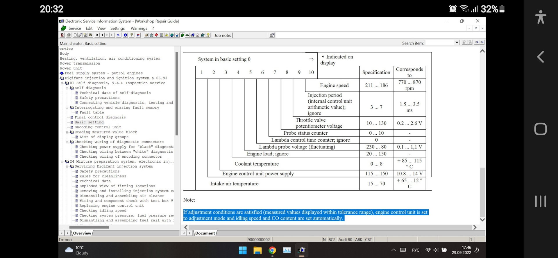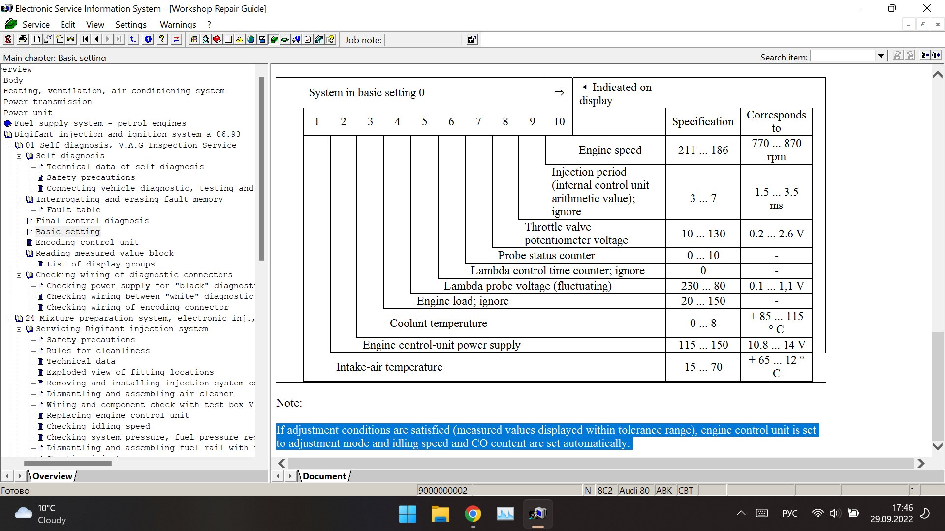 Если условия регулировки выполняются (измеренные значения отображаются в допустимых пределах), блок управления двигателем переводится в режим регулировки, а обороты холостого хода и содержание СО устанавливаются автоматически.