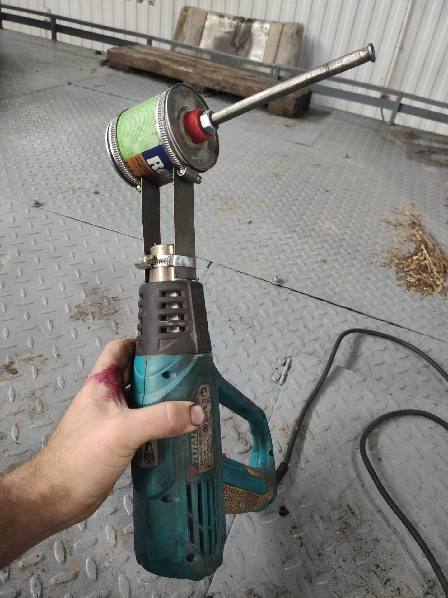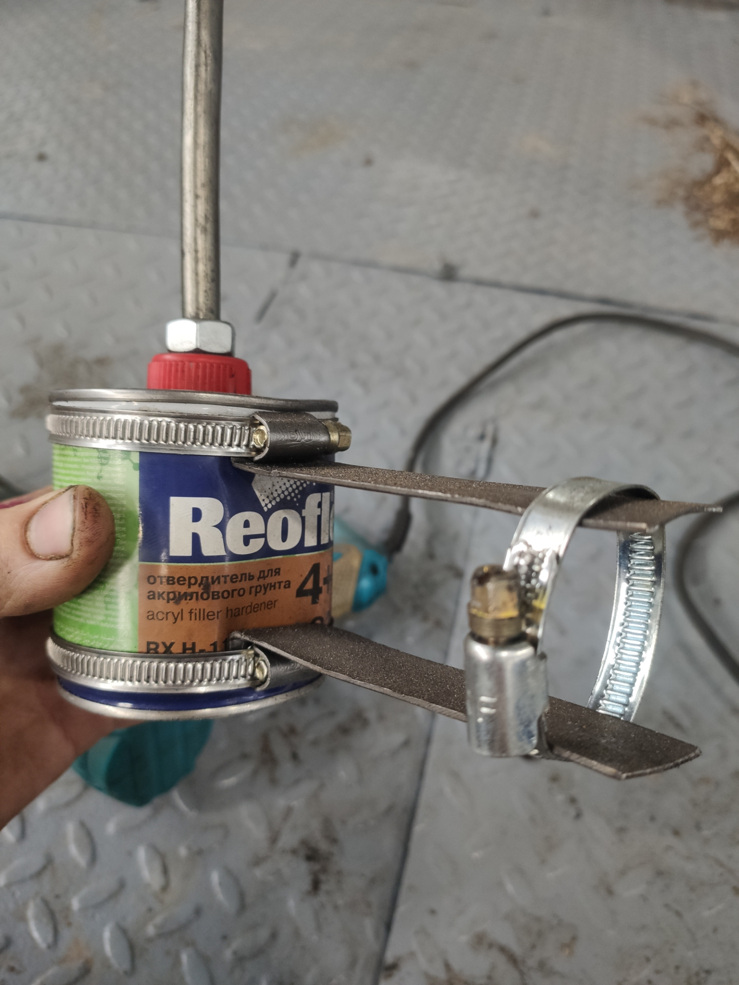 Вобщем не долго думая, из того что было под рукой, собрал инструмент. Понадобилось 3 хомута, две пластинки из миллиметровки, небольшая баночка и попавшаяся под руки масляная трубка от Газона. Трубка толстостенная (для трубки конечно же), на ней нарезал немного резьбы и двумя гайками закрепил на пластиковой пробке. Всё! Заливаем в баночку растворитель и крепим её на строительный фен, устройство готово.