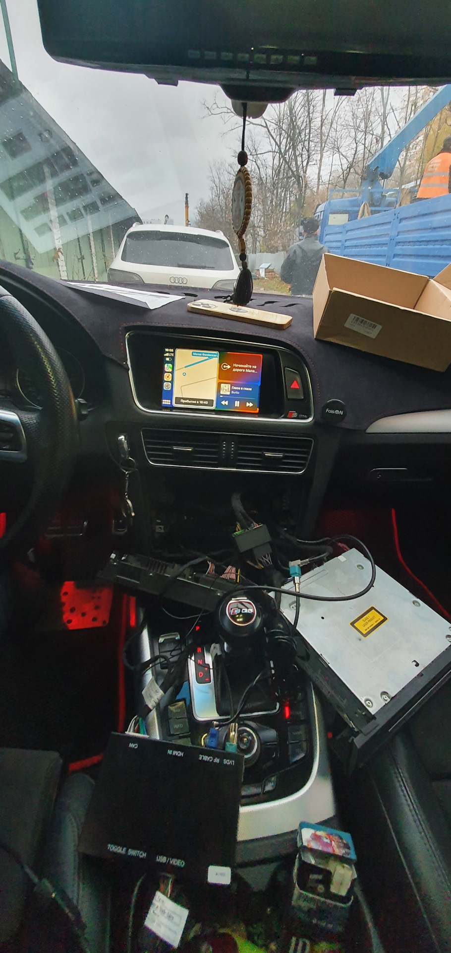 Для запуска этой коробочки на самом блоке есть переключатели, нужно выставить, как в прилагаемой инструкции для Q5. Сначала выставили для Q5, но в режиме carplay отключалась клавиатура. Решением стало выставление переключателей для А4 2010-2011 годов и все заработало как надо.