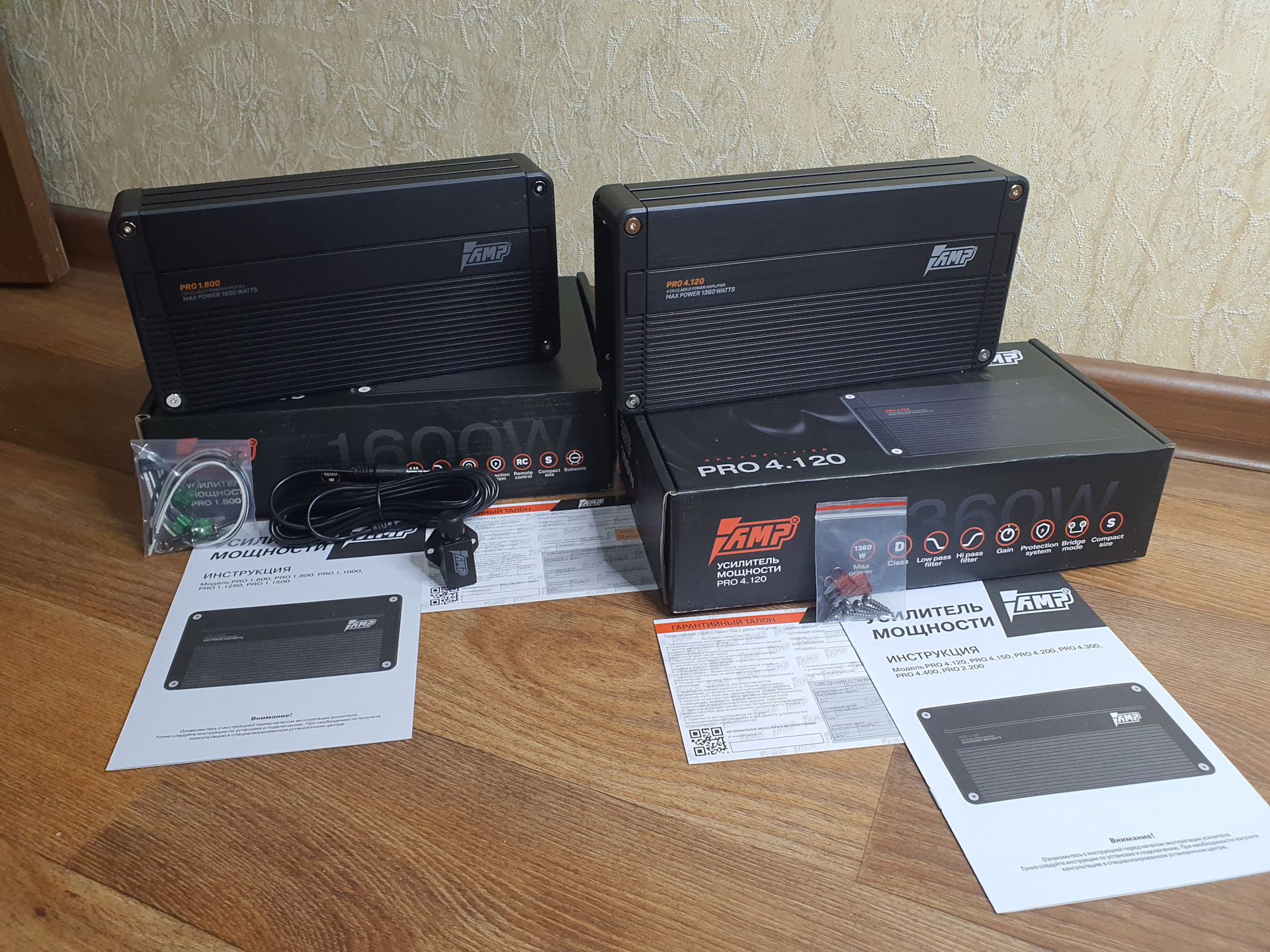 Упаковано все как всегда на высшем уровне, спасибо магазину Автоазарт за их подход к доставке. Внутри коробочек ждут сами усилители, немного макулатуры (гарантийный талон и инструкция), болты для крепления и предохранители на 40 А, а к моноблоку еще идет выносной регулятор баса и провод для его подключения.