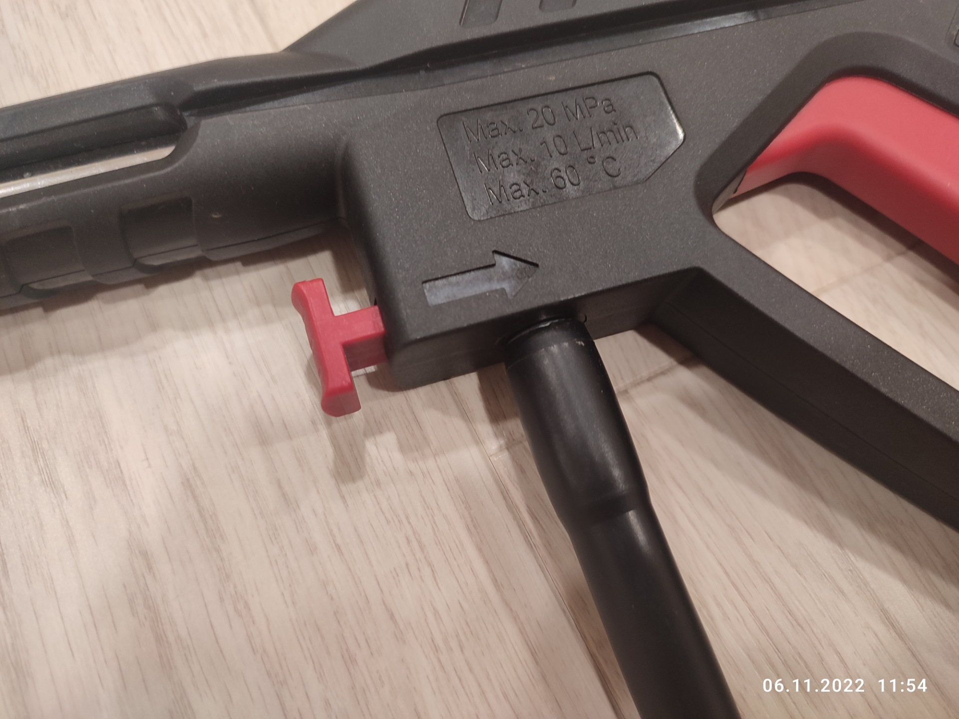 Пистолет с фиксацией шланга, и с кнопкой фиксации курка, вон её видно… красная круглая😁