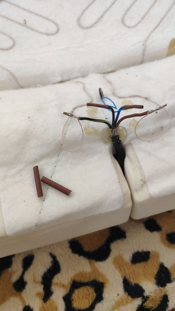 Лень — двигатель прогресса, а значит делаем купирование неисправного участка сразу от ввода (чтобы было меньше кривых соединений), и пробуем соединить с старой нитью на ровном месте, (конечно обжигаем старый кабель, скручиваем) замеряем… 3,8 Ом – это победа! Раз уж такие дела, правый бок тоже переделываем на всякий случай. В итоге получаем 3,6 Ом на спинку, что вполне не плохо!