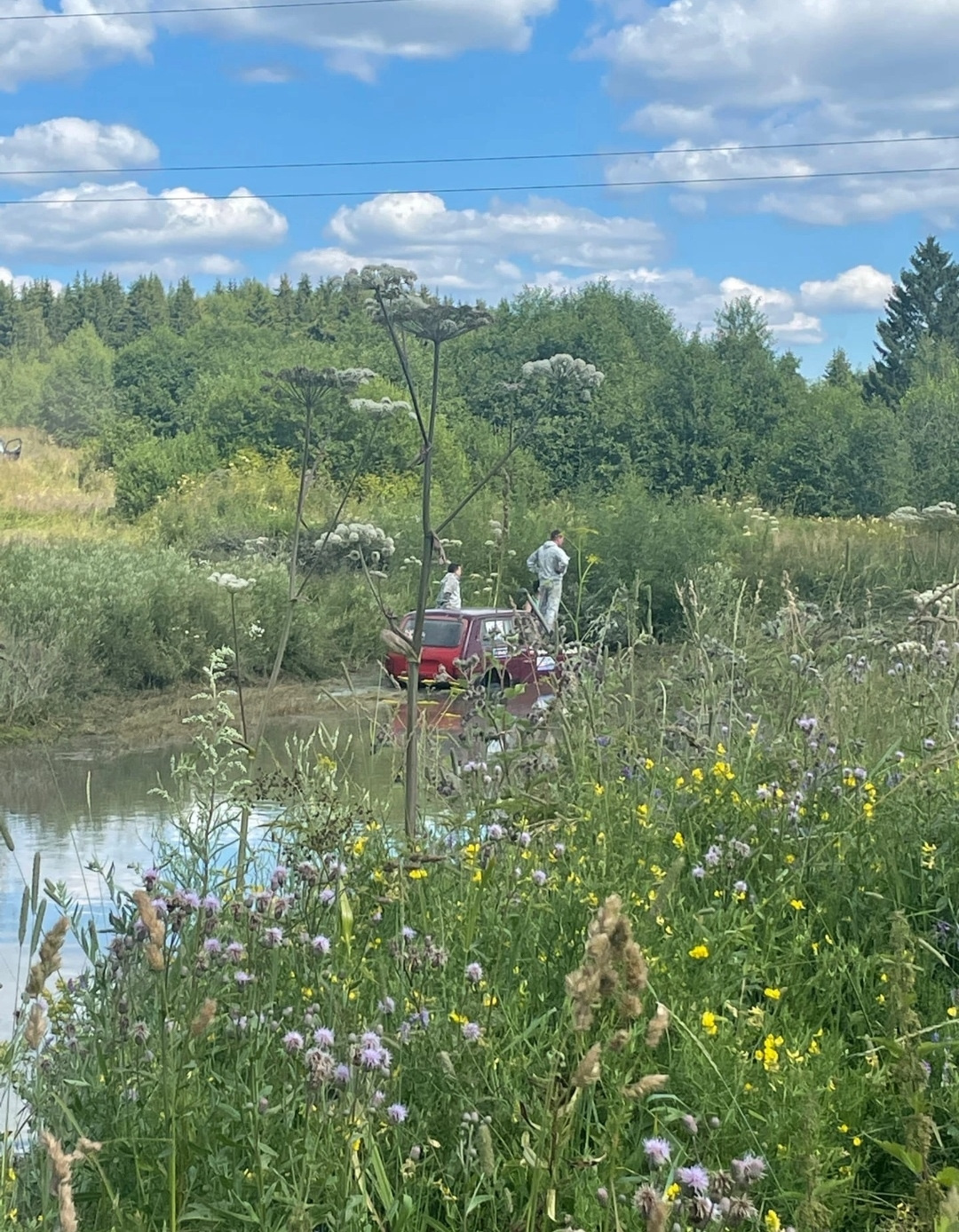 Первый и второй заезд мы приехали первыми ну, а в третьем объезжав застрявший экипаж в броду сели на покрышки которые организаторы несколько лет назад насыпали в брод.