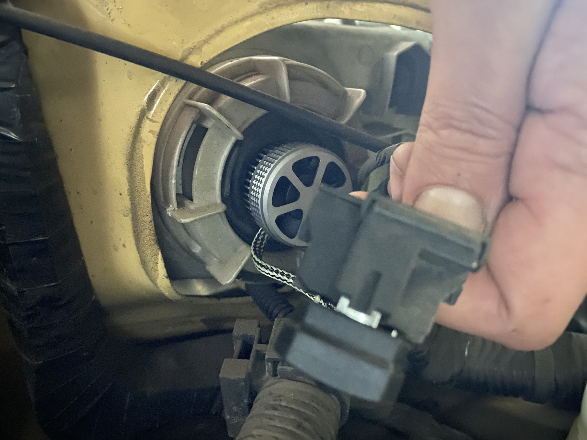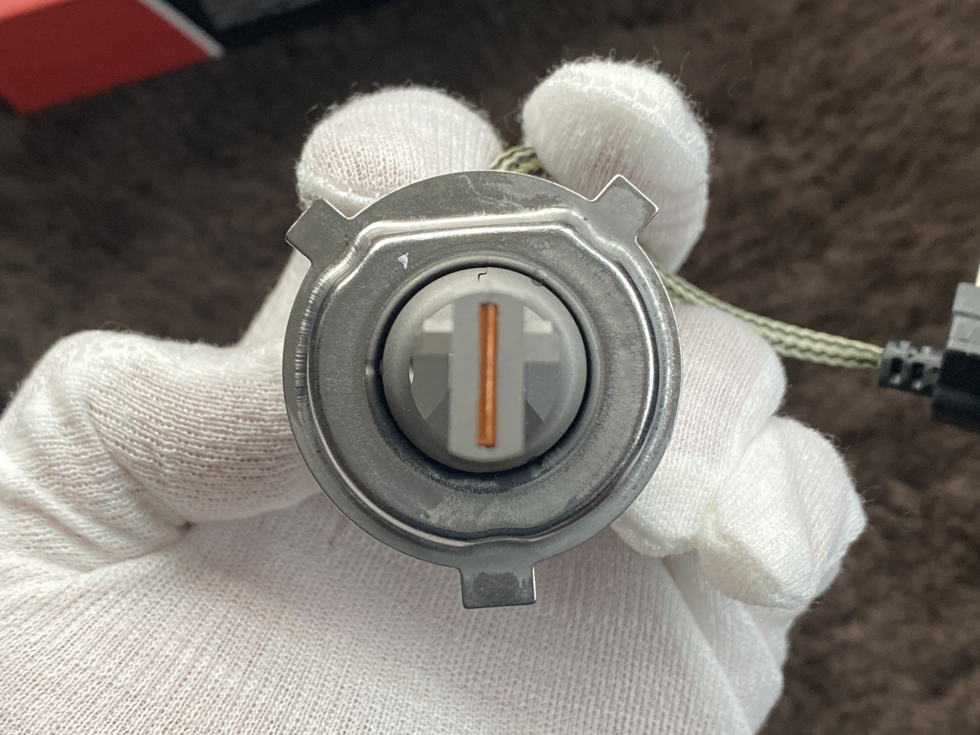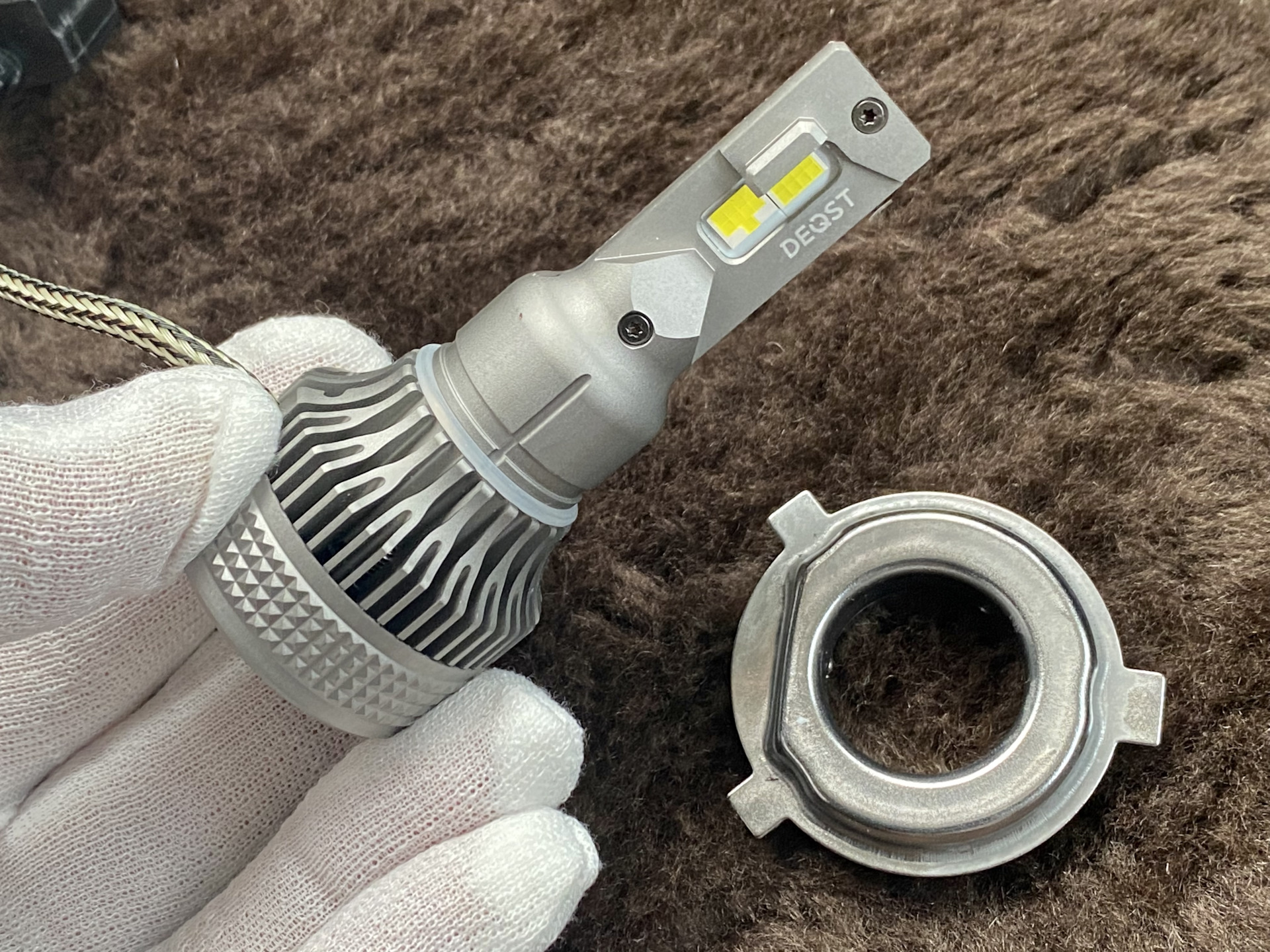 Так как в фарах лампы внутри, а штекера снаружи, то первым делом нужно просунуть лампу через оригинальный пыльник и потом в таком положении установить.