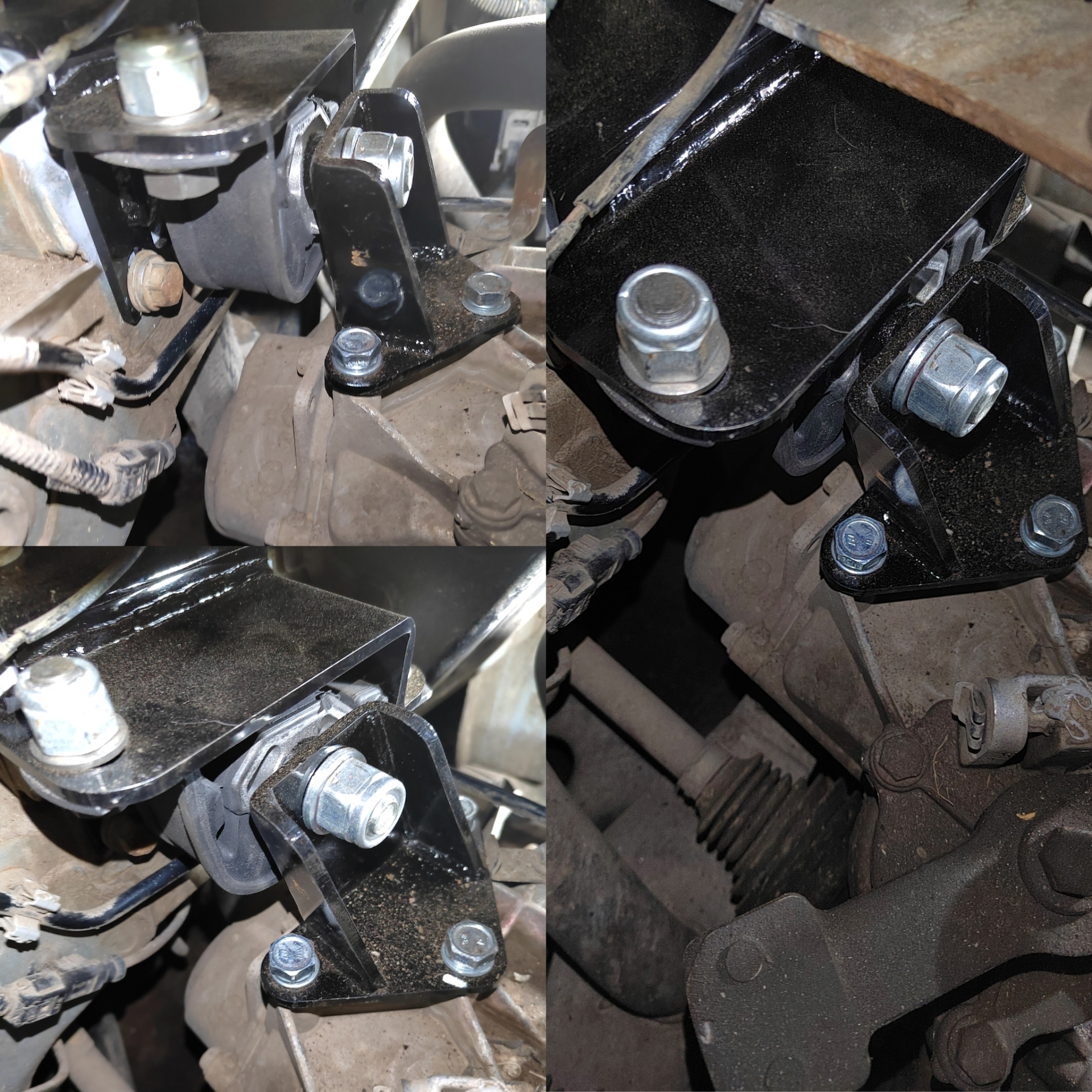Немного зачистил и пыльнул это место грунтом. Далее, прикрутил кронштейн новой опоры штатными болтами к лонжерону, затем кронштейн с подушкой, прикрутил, тремя болтами из комплекта, к самой КПП.