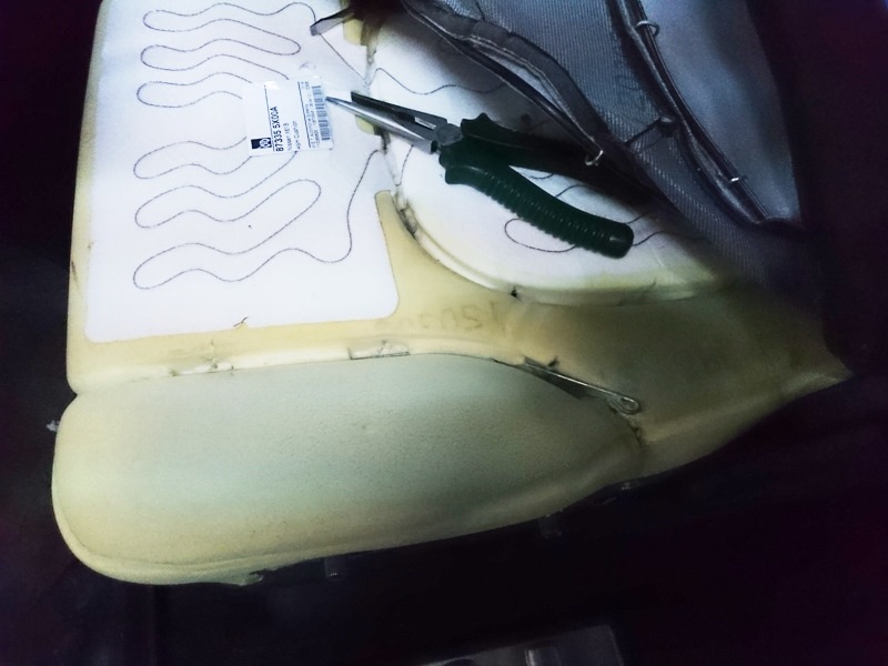 Менять стали не снимая сиденья, все крепёжные кольца были варварски разогнуты, старый попогрев отодран (не, не в тему слово, нехорошее какое-то ) оторван вместе со старым поролоном, в последствии переклеен с этими же кусками на новую сидушку бытовым клеем. Бедолага слесарь повредил палец при натягивании обивки и испачкал обогрев кровью, мои глаза чуть не выпали, я любезно попросил убрать кровь, дабы при очередной экспертизе (а она буде, если мне полностью не заменят сиденье) эксперт не подумал, что на этой машине ездит дама с неконтролируемыми месячными, надо отдать должное пареньку, всё убрал, это было самое лучшее что он смог сделать. Обивку натянул отвратительно, закрепил не все колечки стяжки и теперь у сиденья нет формы и вот так выглядит этот бардак